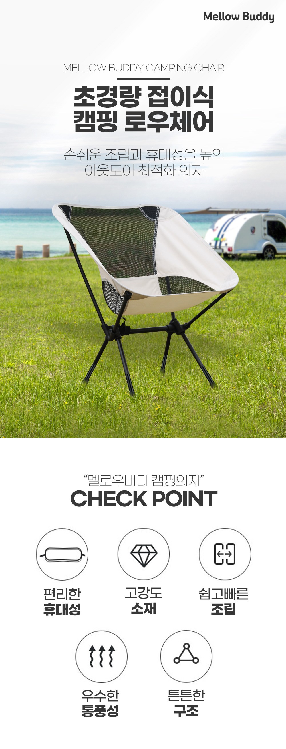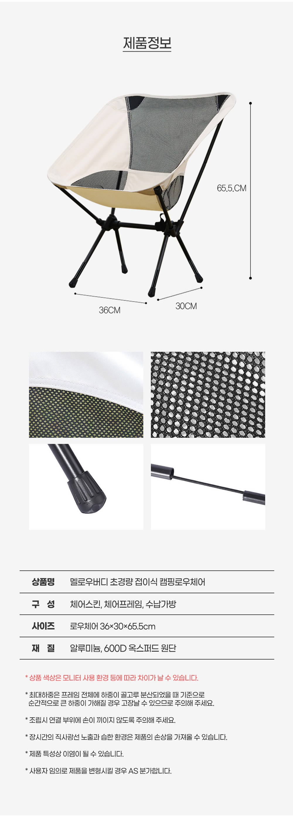 | 품명 및 모델명 | 멜로우버디 초경량 접이식 캠핑로우체어 | KC 인증정보 | 해당없음 |