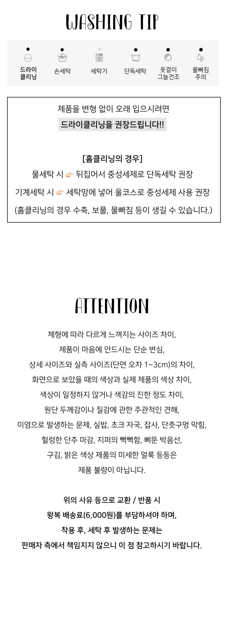 | 제조국 | 중국OEM | 세탁방법 및 취급시 주의사항 | 제품을 오래 입으시려면 드라이클리닝 권장합니다.물세탁시 세탁망에 뒤집어 넣어서 중성세제 사용하여 섬세코스로 해주세요. |