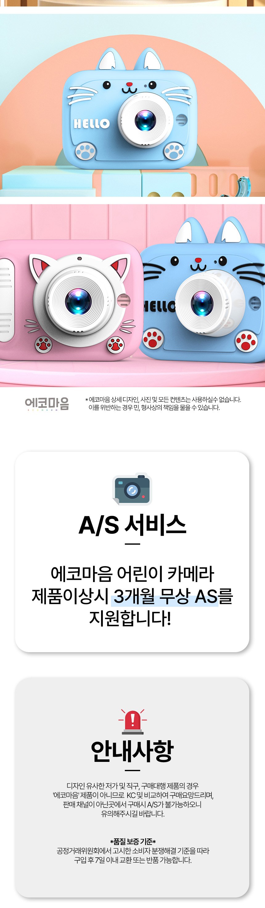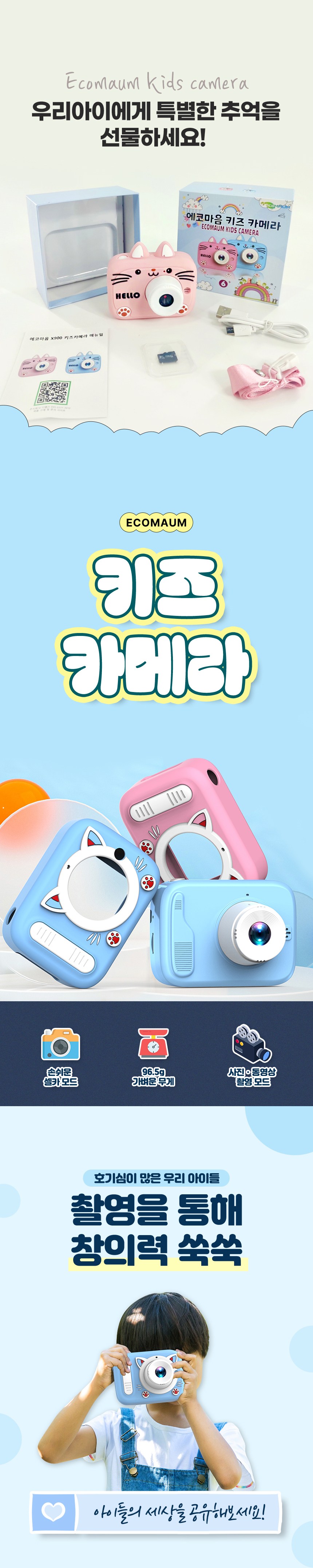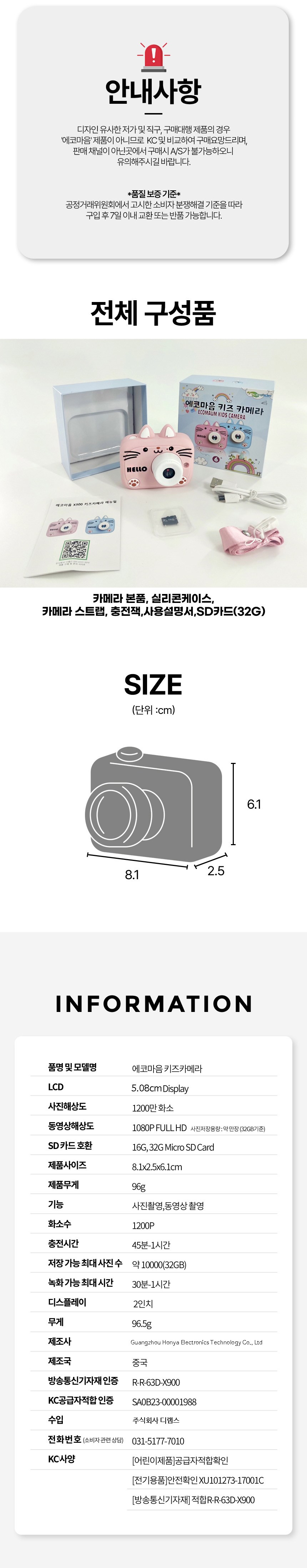 | 품명 및 모델명 | 에코마음 키즈카메라 32G/ X-900 | KC 인증정보 | 본품: 유/KC마크, R-R-63D-X900 / 전지: XU101273-17001C |