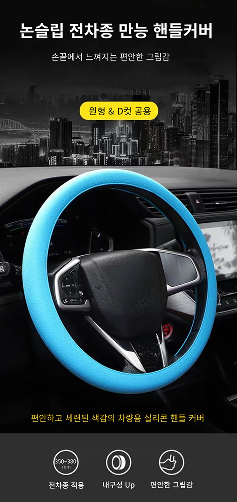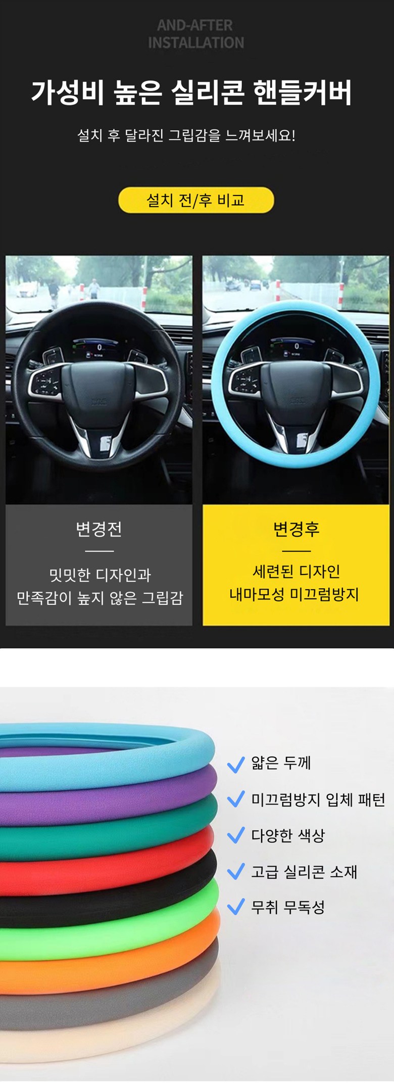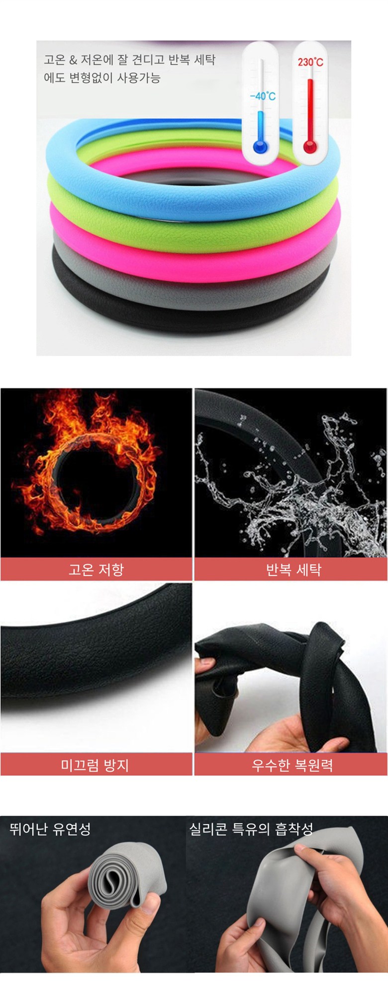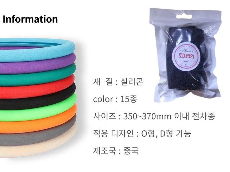 | 품명 및 모델명 | 실리콘 자동차 얇은 원형 전차종 공용 핸들커버 | 인증/허가 사항 | 해당사항없음 |