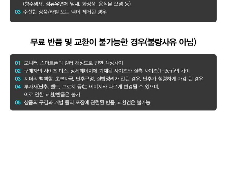 - ㆍ모니터 해상도의 차이로 인해 색상이나 이미지가 실제와 달라, 고객이 단순 변심으로 교환/반품을 무료로 요청하는 경우