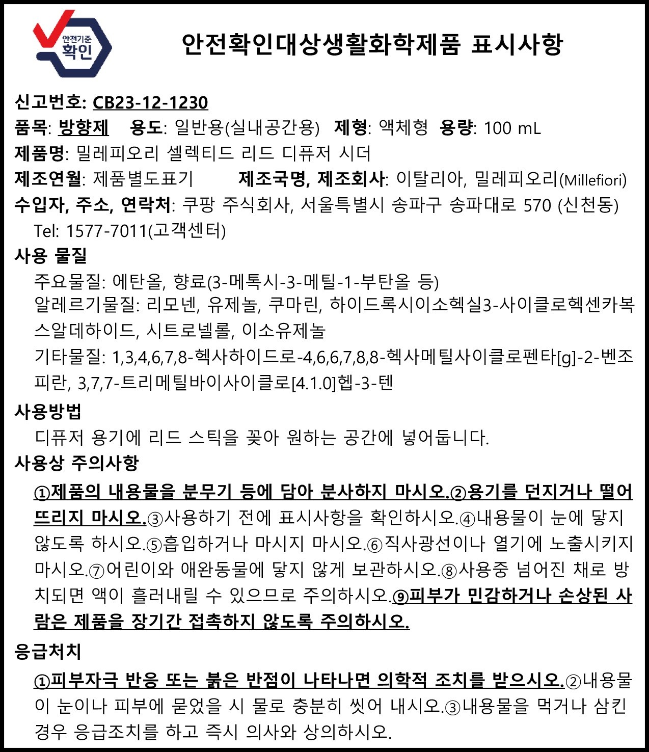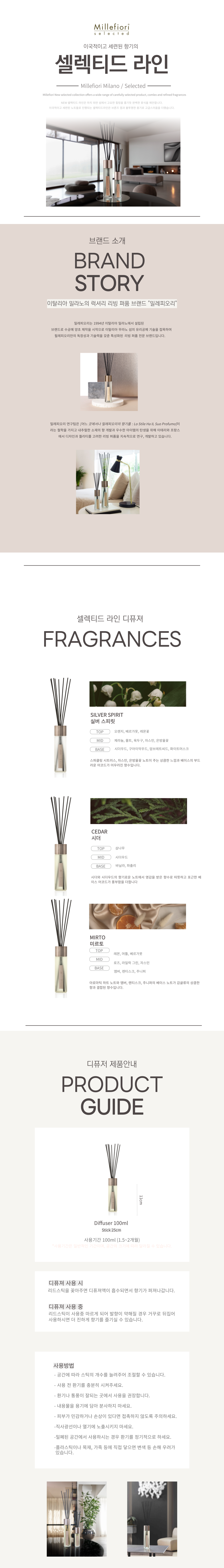 | 품목 및 제품명 | 방향제 / 밀레피오리 셀렉티드 리드 디퓨저 시더 | 용도(표백제의 경우 계열을 함께표시) 및 제형 | 일반용(실내공간용) / 액체형 |
