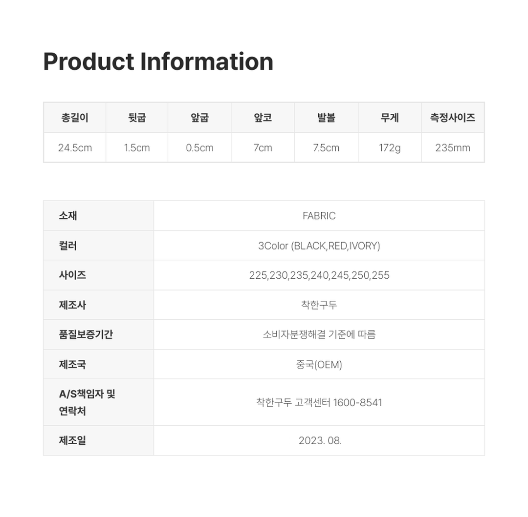 | 치수 | 컨텐츠 참조 | 제조자(수입자) | 착한구두 / 업체 미제공 |