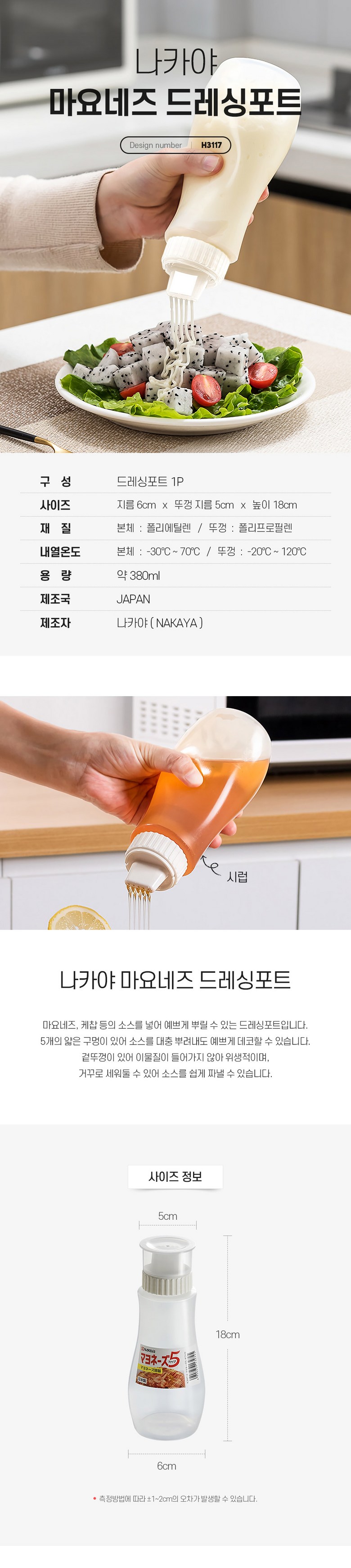 | 품명 및 모델명 | 마요네즈 드레싱포트 | 재질 | 폴리에틸렌(본체),폴리프로필렌(뚜껑) |