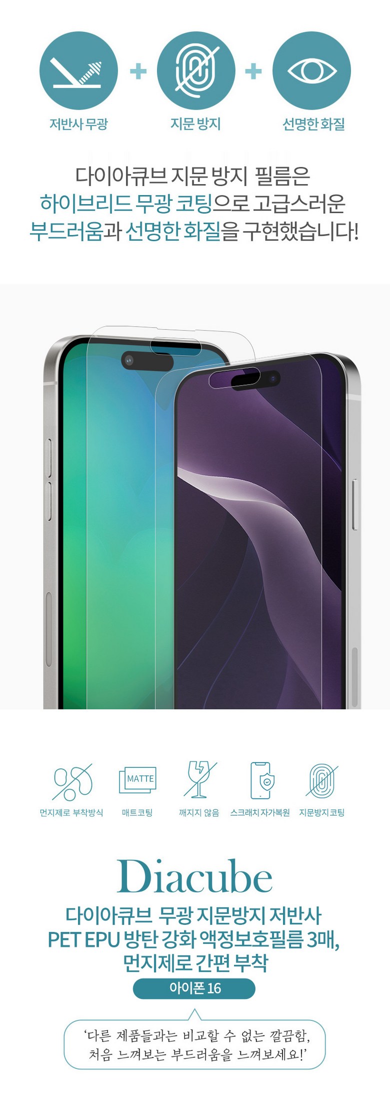 | 품명 및 모델명 | 다이아큐브 아이폰16프로 AF 지문방지 저반사 무광코팅 PET EPU 풀커버 액정보호필름 3P 자동먼지제거 쉽고 빠른 부착 | 인증/허가 사항 | 알코올솜패드 안전기준 적합확인 신고번호: 제 HB20-02-0189호(한국환경산업기술원) |