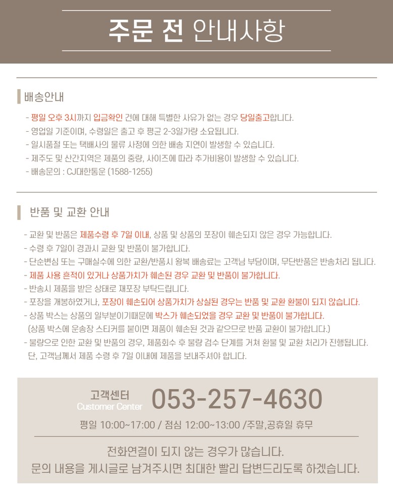 - ㆍ모니터 해상도의 차이로 인해 색상이나 이미지가 실제와 달라, 고객이 단순 변심으로 교환/반품을 무료로 요청하는 경우
