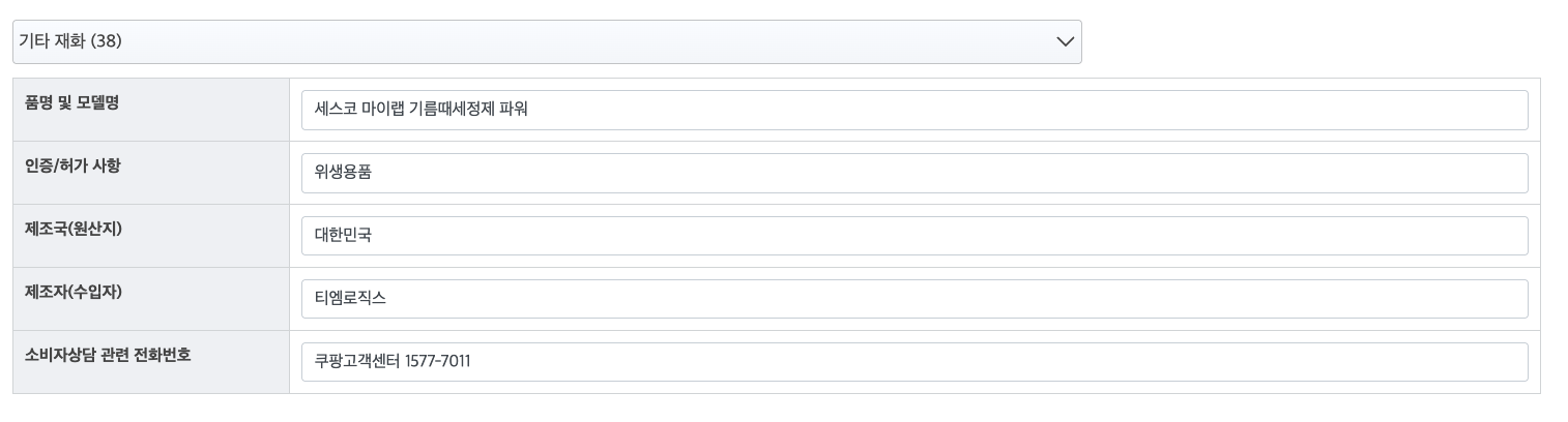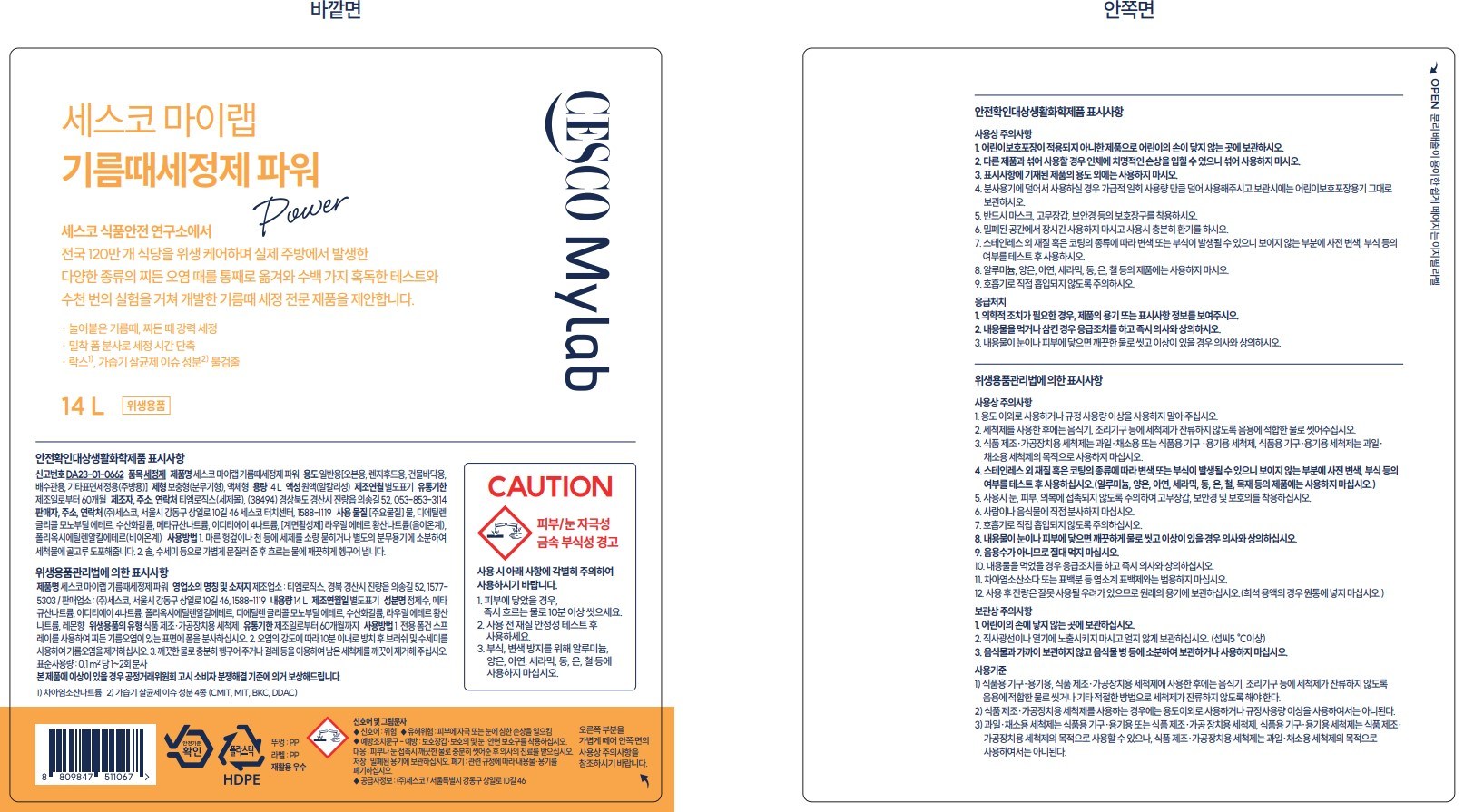| 품목 및 제품명 | 세정제 / 세스코 마이랩 기름때세정제 파워 | 용도(표백제의 경우 계열을 함께표시) 및 제형 | 일반용[오븐용, 렌지후드용, 건물바닥용, 배수관용, 기타표면세정용(주방용)] / 보충형(분무기형), 액체형 |