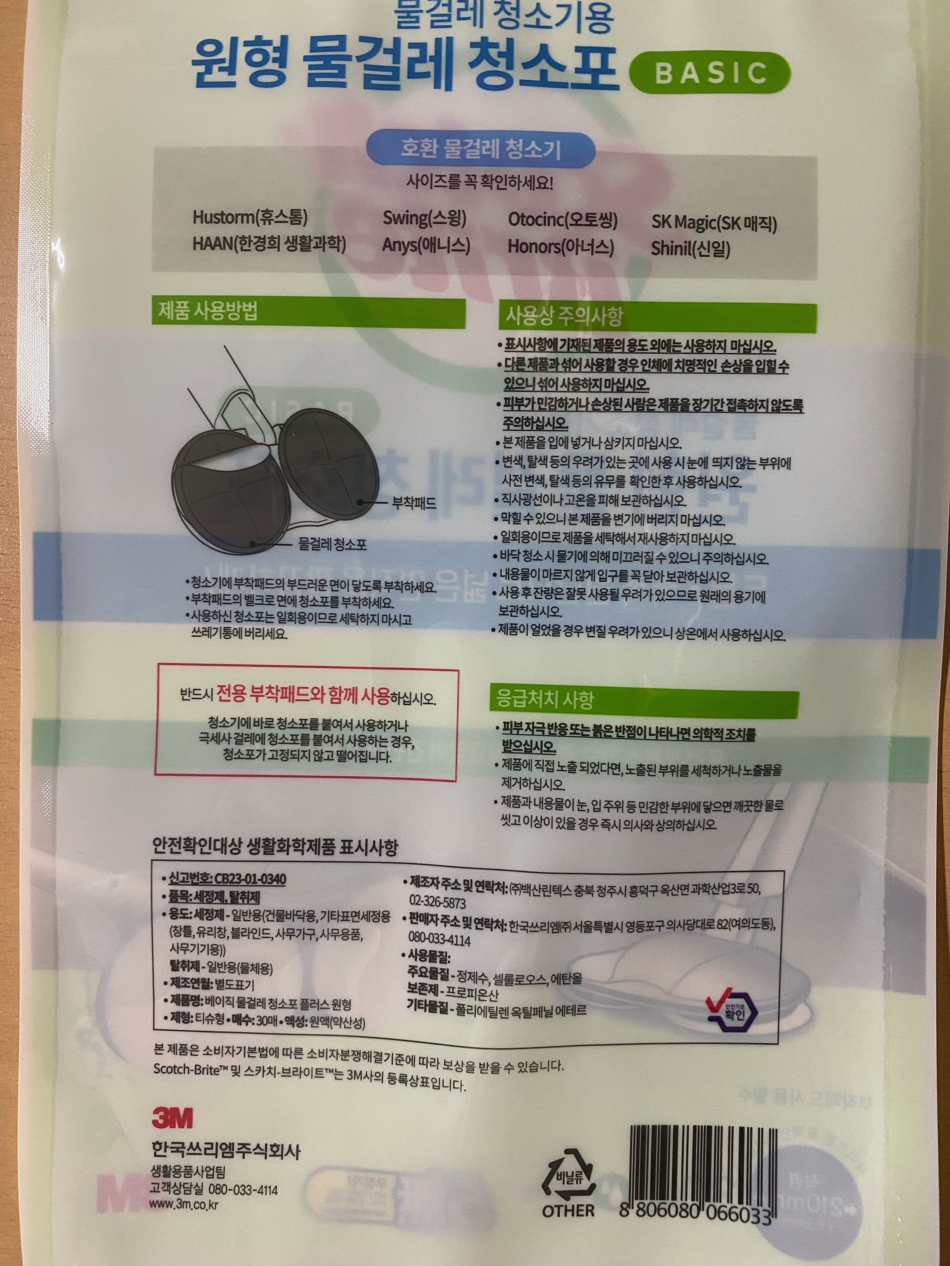 | 품목 및 제품명 | 세정제,탈취제 / 베이직 물걸레 청소포 플러스 원형 | 용도(표백제의 경우 계열을 함께표시) 및 제형 | 세정제 - 일반용(건물바닥용, 기타표면세정용(창틀,유리창,블라인드,사무가구,사무용품,사무기기용)), 탈취제 - 일반용(물체용) / 티슈형 |