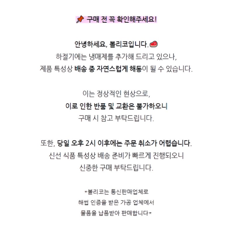 | 배송방법 | 신선/냉장/냉동 | 배송비 | 무료배송 · 도서산간 추가 배송비 - 제주 지역: 3,500원 - 도서산간 지역: 7,000원 |