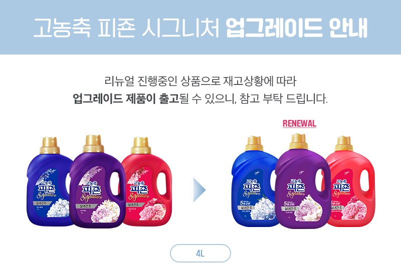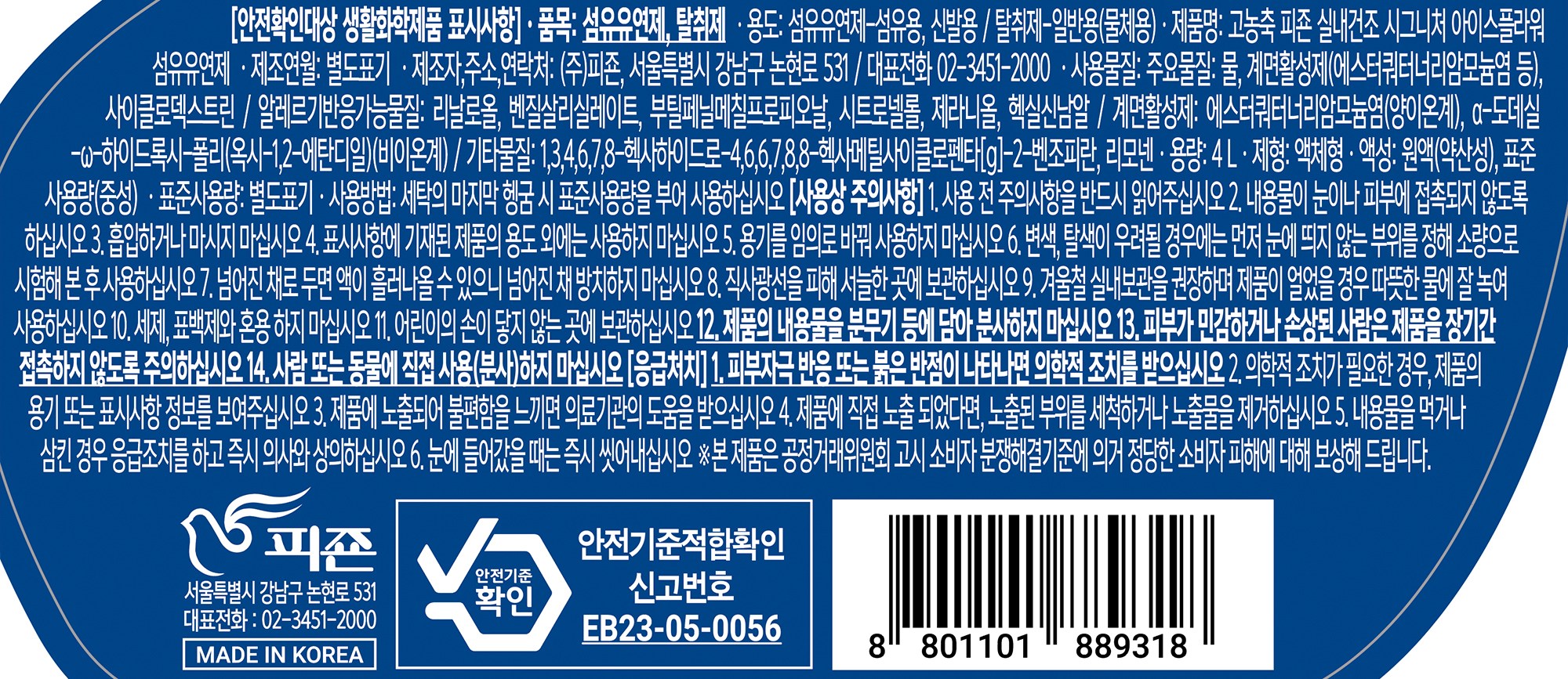 | 품목 및 제품명 | 섬유유연제,탈취제 / 고농축 피죤 실내건조 시그니처 아이스플라워 섬유유연제 | 용도(표백제의 경우 계열을 함께표시) 및 제형 | 섬유유연제-섬유용, 신발용/탈취제-일반용(물체용)/ 액체형 |