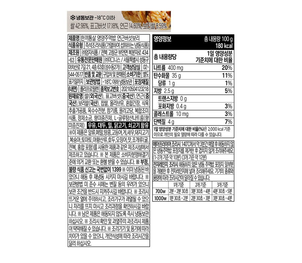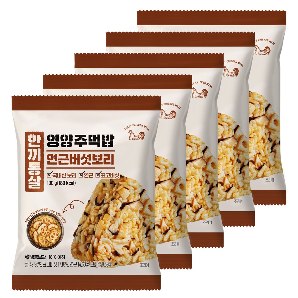 한끼통살의 주먹밥과 함께 간편한 한 끼를 즐겨보세요. 쫄깃한 표고버섯과 아삭한 연근이 만나 다채로운 식감을 선사하는데요. 구수한 보리쌀을 더해 담백한 풍미를 완성했답니다. 에어프라이어나 전자레인지로 간단하게 조리해 드셔보세요.