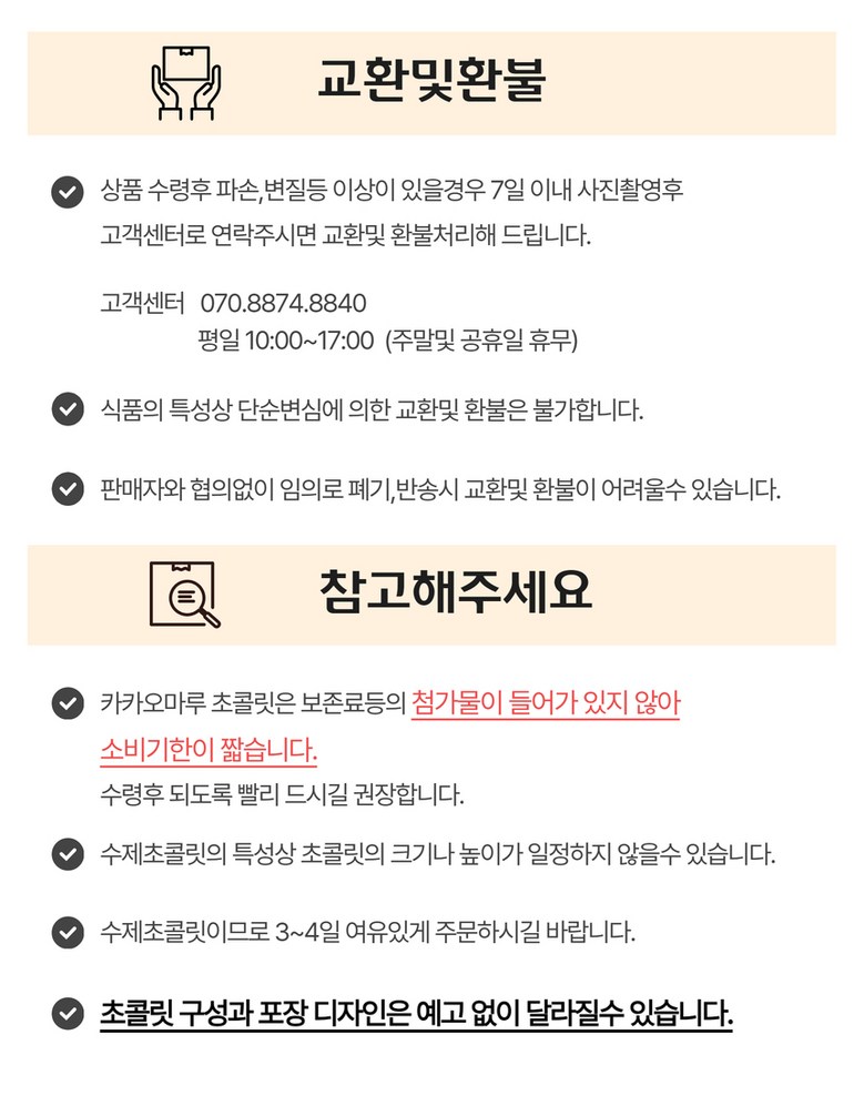 - ㆍ모니터 해상도의 차이로 인해 색상이나 이미지가 실제와 달라, 고객이 단순 변심으로 교환/반품을 무료로 요청하는 경우