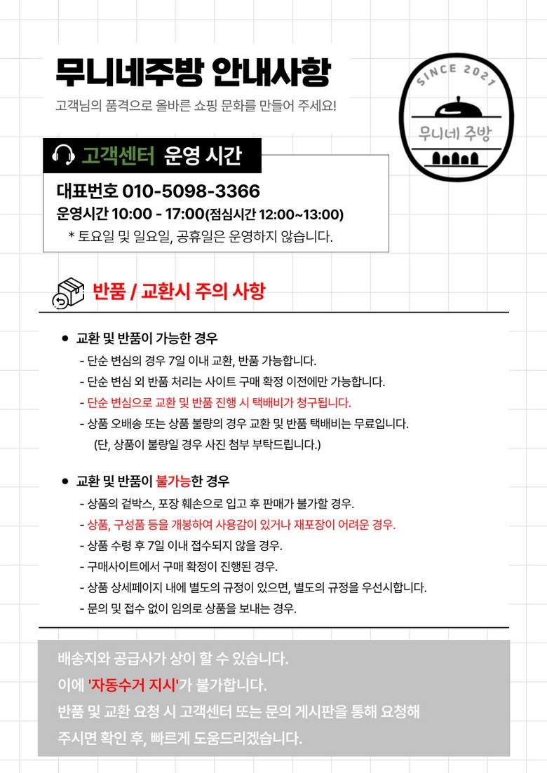- ㆍ모니터 해상도의 차이로 인해 색상이나 이미지가 실제와 달라, 고객이 단순 변심으로 교환/반품을 무료로 요청하는 경우