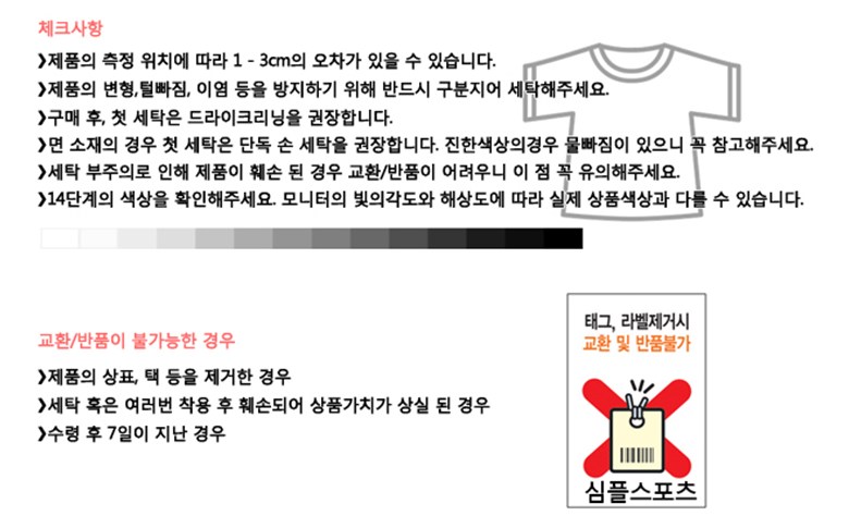 - ㆍ모니터 해상도의 차이로 인해 색상이나 이미지가 실제와 달라, 고객이 단순 변심으로 교환/반품을 무료로 요청하는 경우