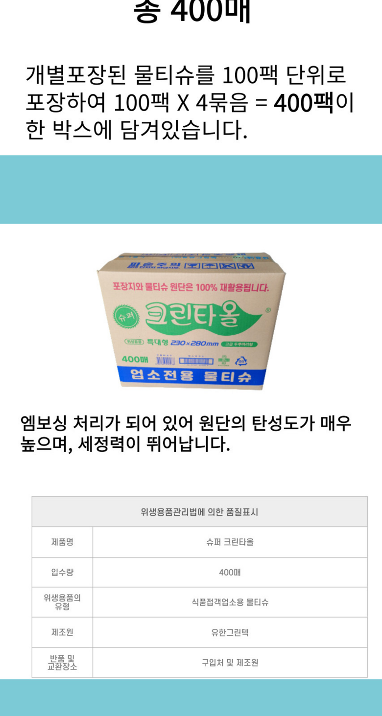 | 품명 및 모델명 | 슈퍼 크린타올 400매 | 인증/허가 사항 | 상품 상세페이지 참조 |