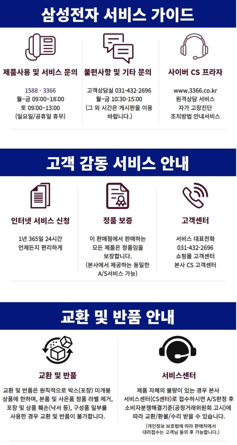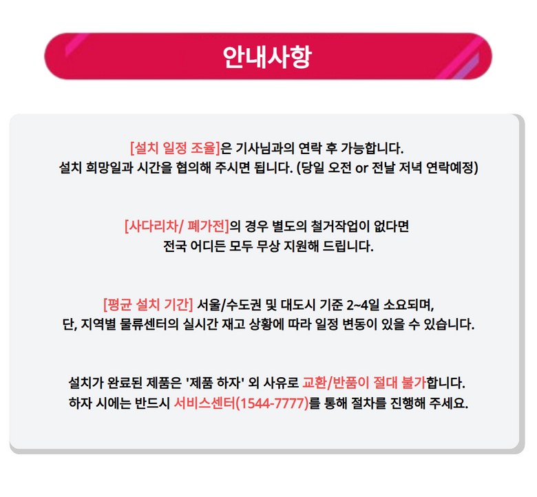- ㆍ제조사의 사정 (신모델 출시 등) 및 부품 가격 변동 등에 의해 무료 교환/반품으로 요청하는 경우