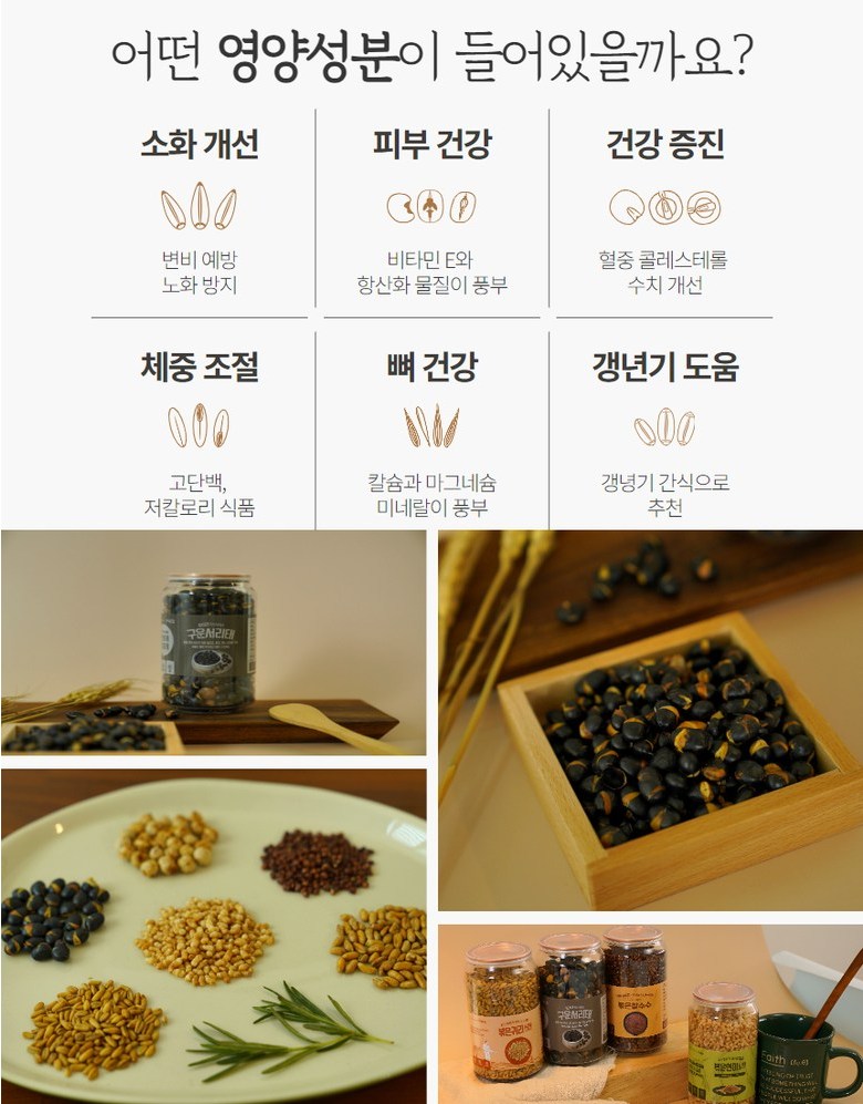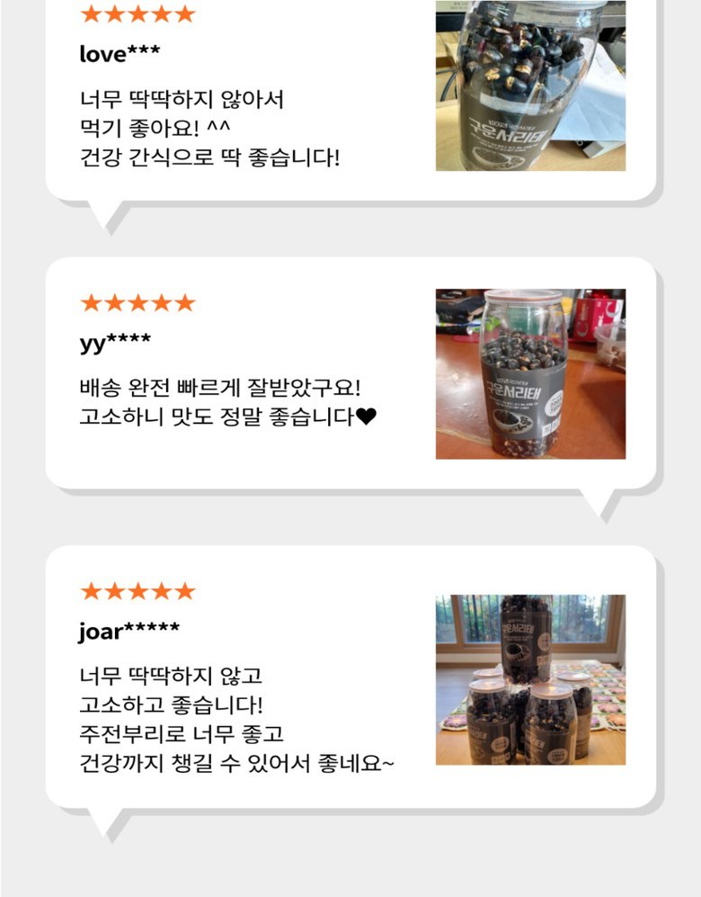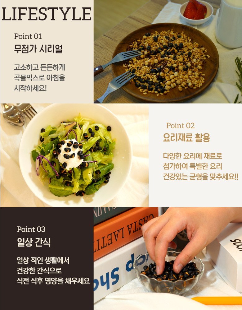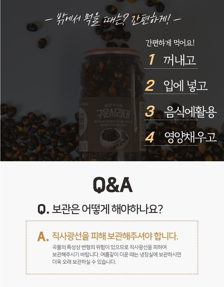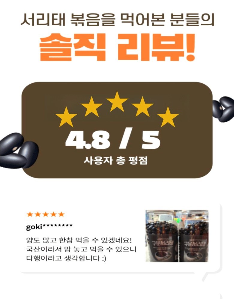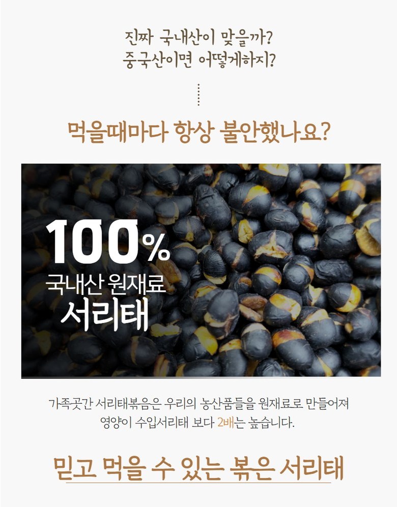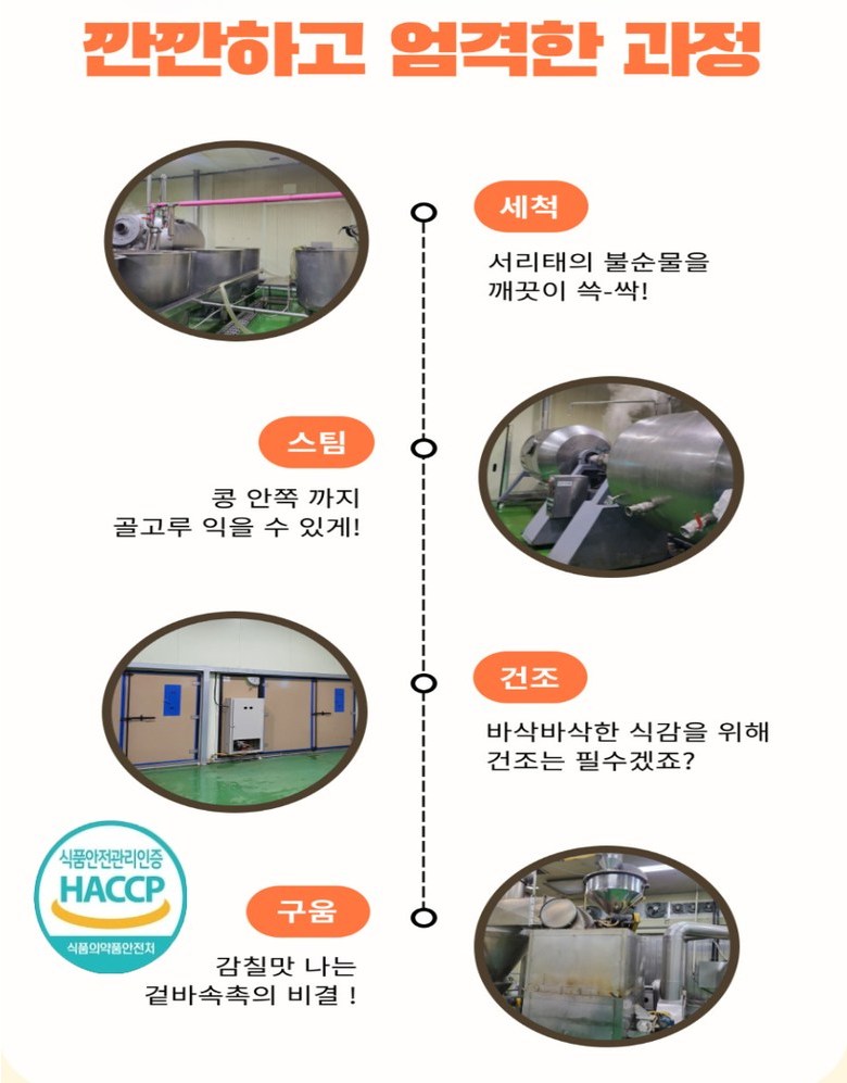 | 제품명 | 서리태볶음 열풍서리태 검은콩볶음 검정콩볶음 건강간식 | 식품의 유형 | 곡류가공업 |