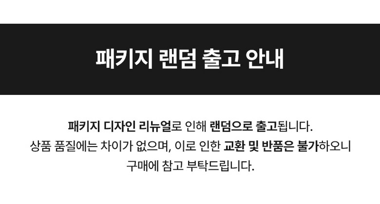 | 교환/반품 신청 기준일 | ㆍ단순변심에 의한 교환/반품은 제품 수령 후 7일 이내까지, 교환/반품 제한사항에 해당하지 않는 경우에만 가능 (배송비용과 교환/반품 비용 왕복배송비 고객부담) ㆍ상품의 내용이 표시·광고의 내용과 다른 경우에는 상품을 수령한 날부터 3개월 이내, 그 사실을 안 날 또는 알 수 있었던 날부터 |