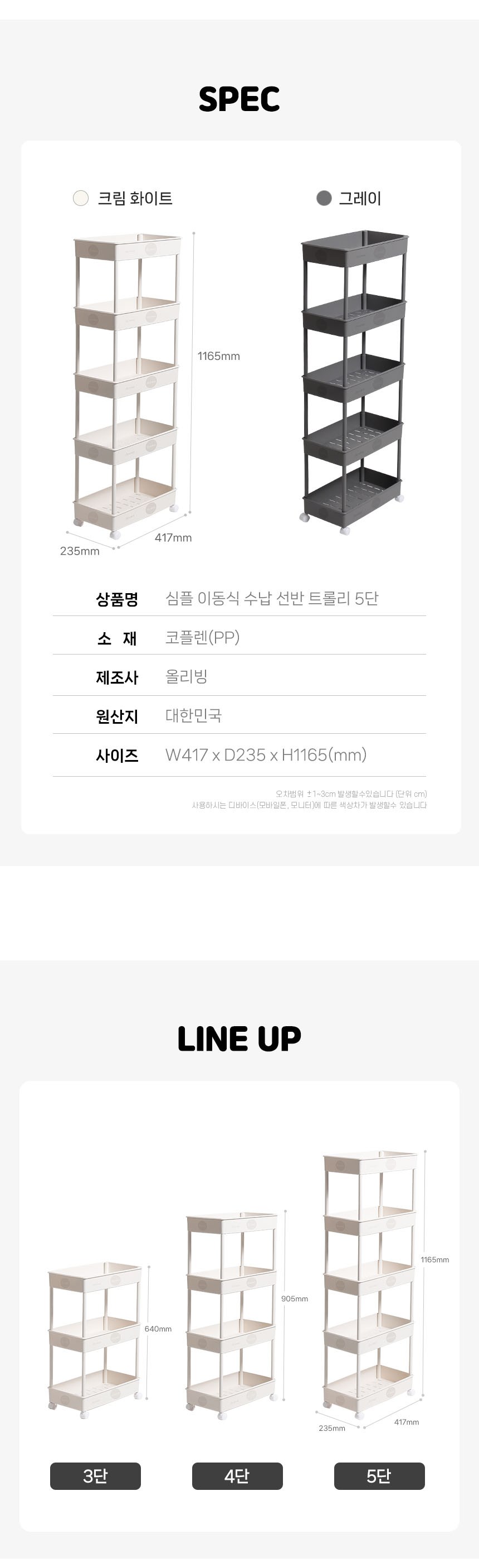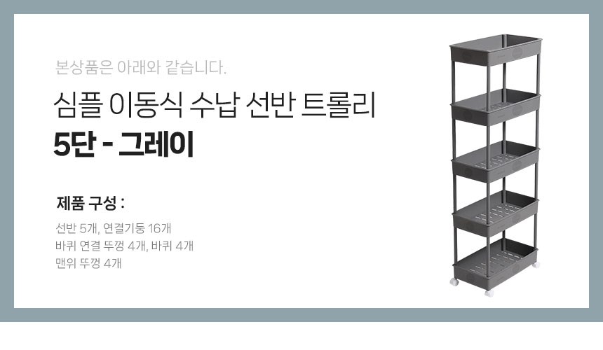 | 품명 및 모델명 | 심플 이동식 수납 선반 트롤리 5단 | 인증/허가 사항 | 해당없음 |