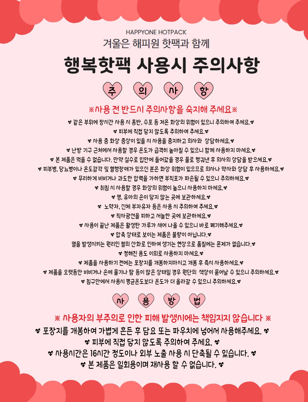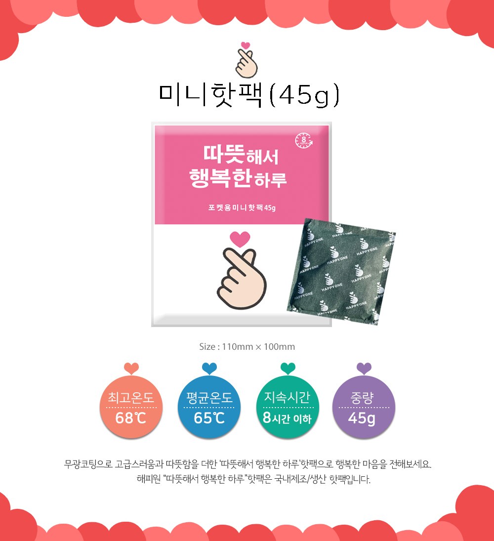 | 품명 및 모델명 | 행복 손하트 포켓용 미니핫팩 / 따뜻해서 행복한 하루 포켓용 핫팩 | 인증/허가 사항 | B683H5004-18001 |
