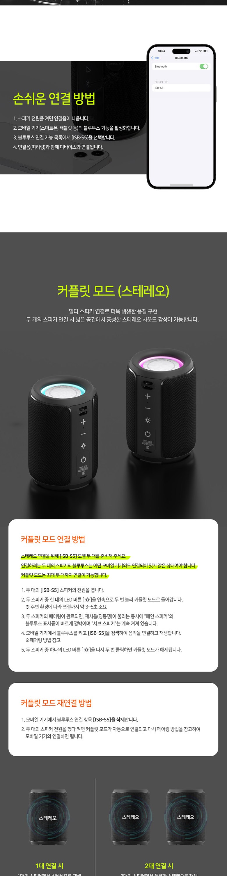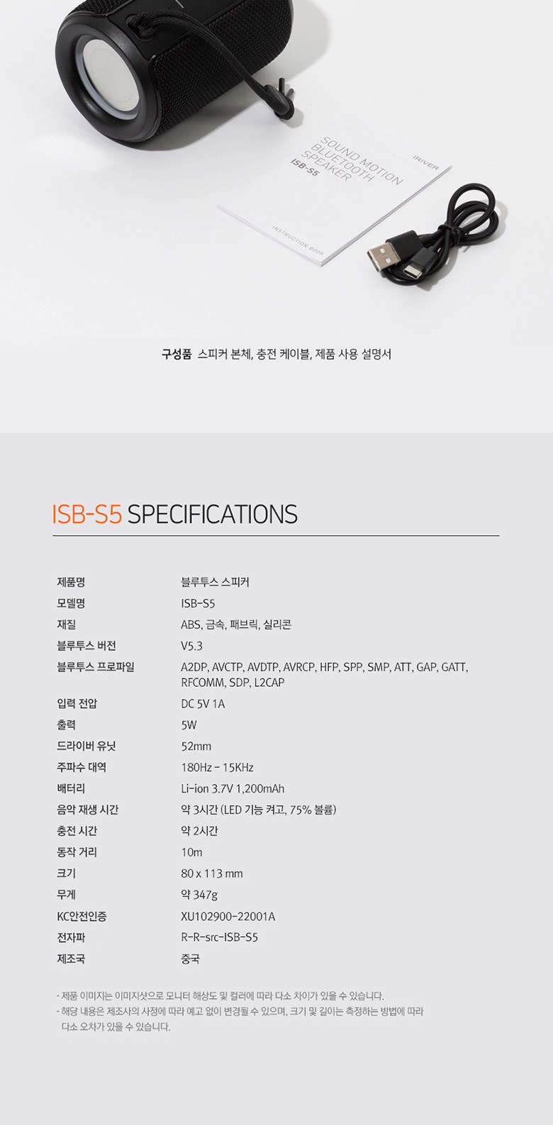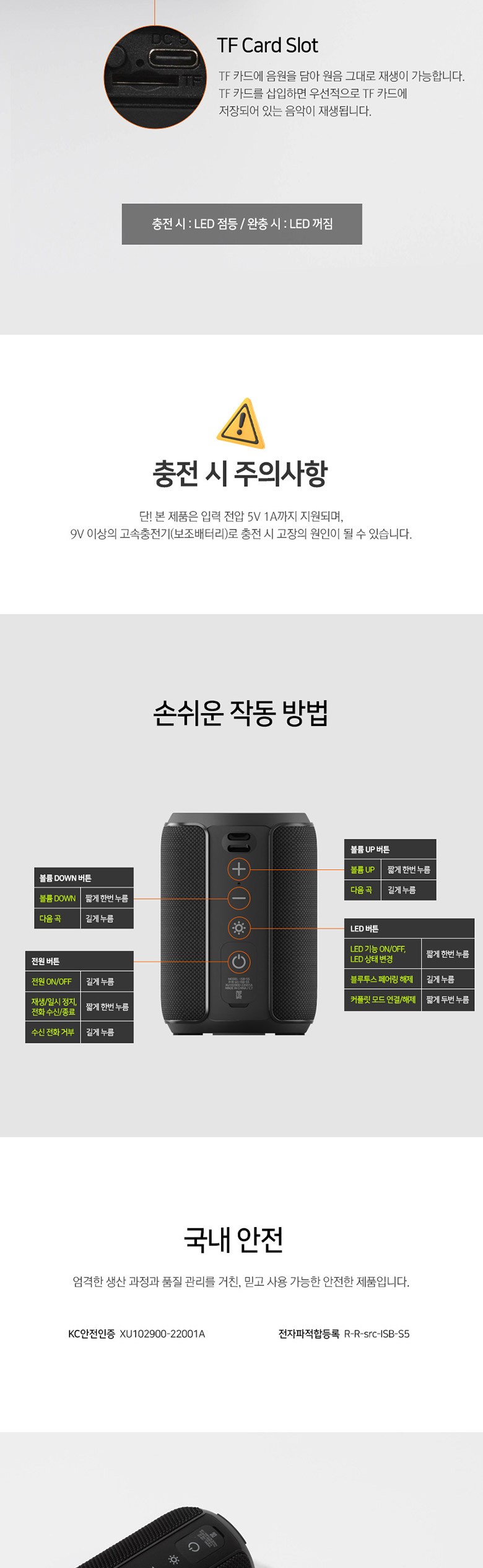 | 품명 및 모델명 | 블루투스 스피커 / ISB-S5 | KC 인증정보 | 본품 : R-R-src-ISB-S5 , 전지 : XU102900-22001A |