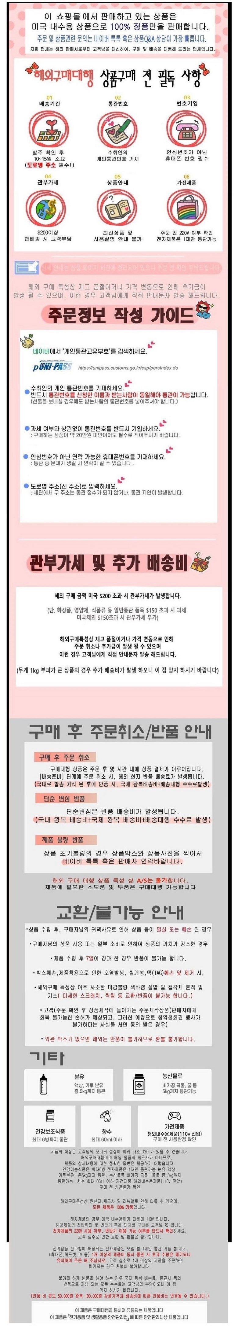 - 법규 개정에 따라 개인통관고유부호 검증 절차가 강화되었습니다. 결제 단계에서 받는 사람의 정보가 관세청 등록 정보 (성명, 휴대폰, 개인통관고유부호, 주소) 와 일치하는지 확인해주세요.