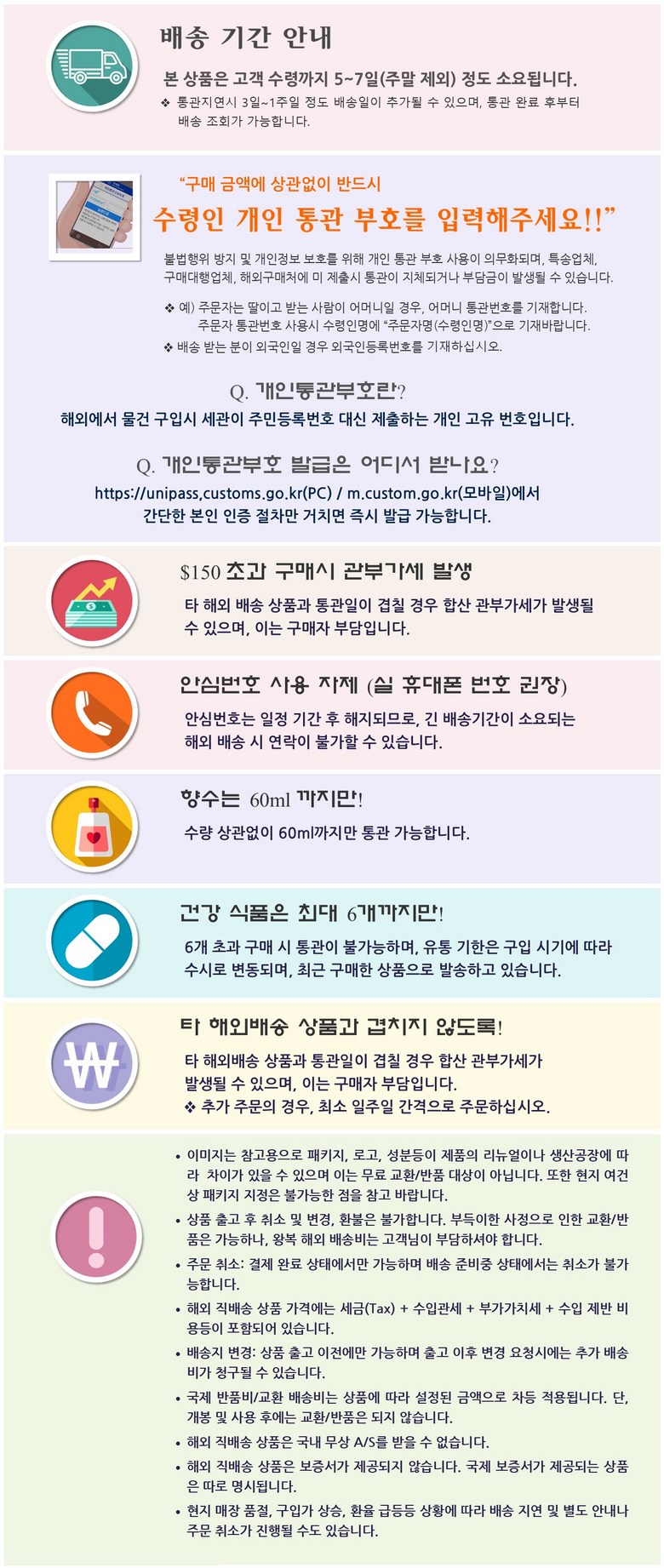 - 주문일 기준 동일 판매자 총 구매 금액이 면세 한도 초과 시 관부가세가 부과될 수 있습니다.