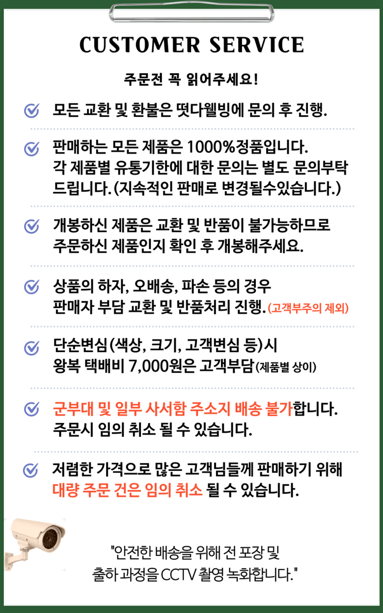 - ㆍ모니터 해상도의 차이로 인해 색상이나 이미지가 실제와 달라, 고객이 단순 변심으로 교환/반품을 무료로 요청하는 경우