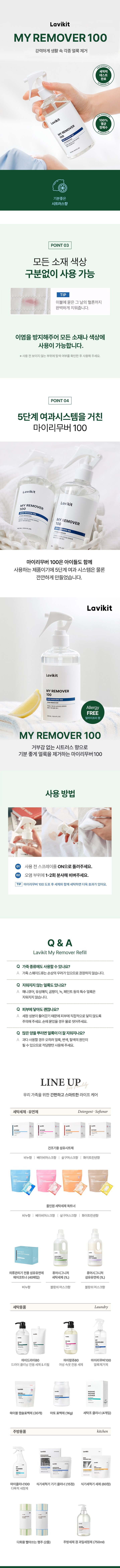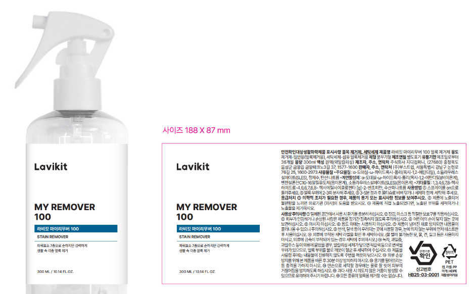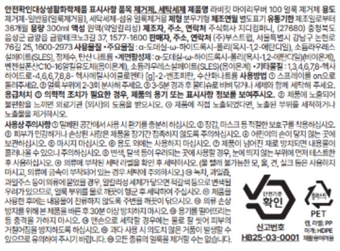 | 품목 및 제품명 | 제거제,세탁세제 / 마이리무버 100 | 용도(표백제의 경우 계열을 함께표시) 및 제형 | 제거제-일반용(얼룩제거용),세탁세제-섬유 얼룩제거용 / 분무기형 |