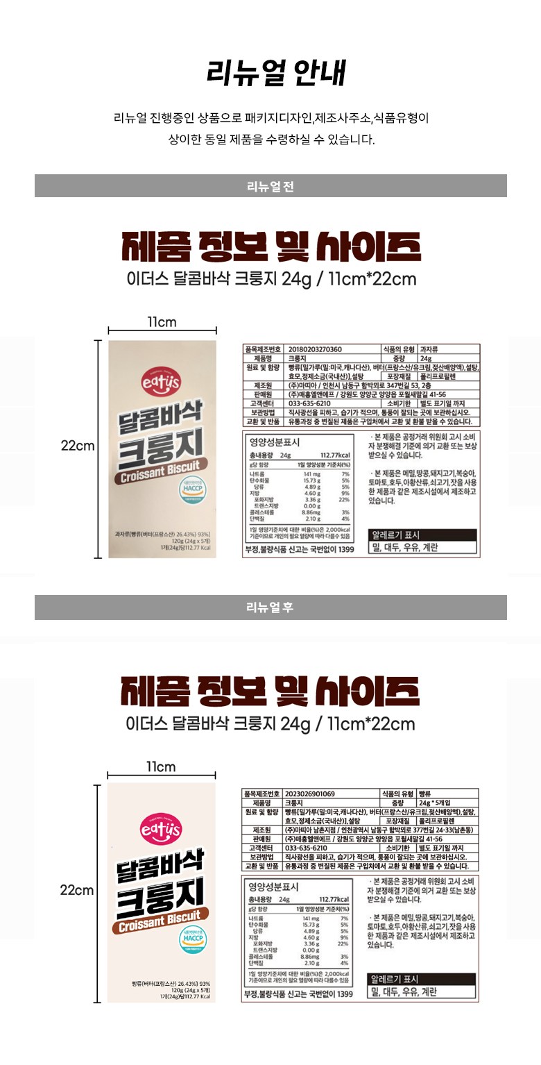 | 생산자 및 소재지 | 리뉴얼 전: 컨텐츠 참조/ 리뉴얼 후: 컨텐츠 참조 | 제조연월일, 소비기한 또는 품질유지기한 | 업데이트 예정 |