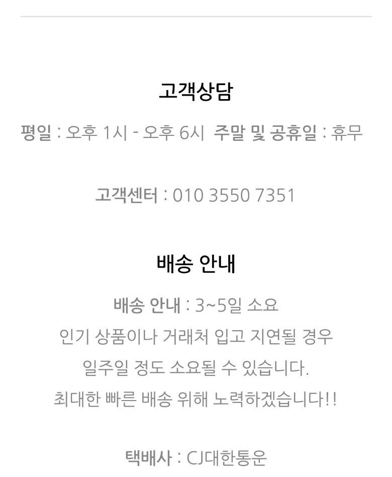 | 배송기간 | ㆍ도서산간 지역 등은 배송에 3-5일이 더 소요될 수 있습니다. - 천재지변, 물량 수급 변동 등 예외적인 사유 발생 시, 다소 지연될 수 있는 점 양해 부탁드립니다. | ||