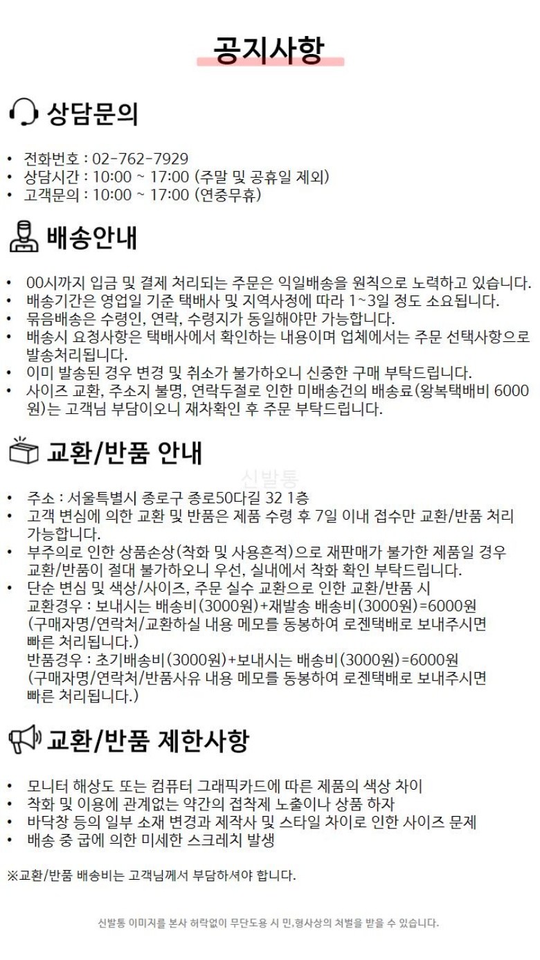 | 교환/반품 비용 (왕복비용) | 6,000원 - 단, 고객 변심의 경우에만 발생 - 도서산간 및 일부 지역 추가비용 발생 |