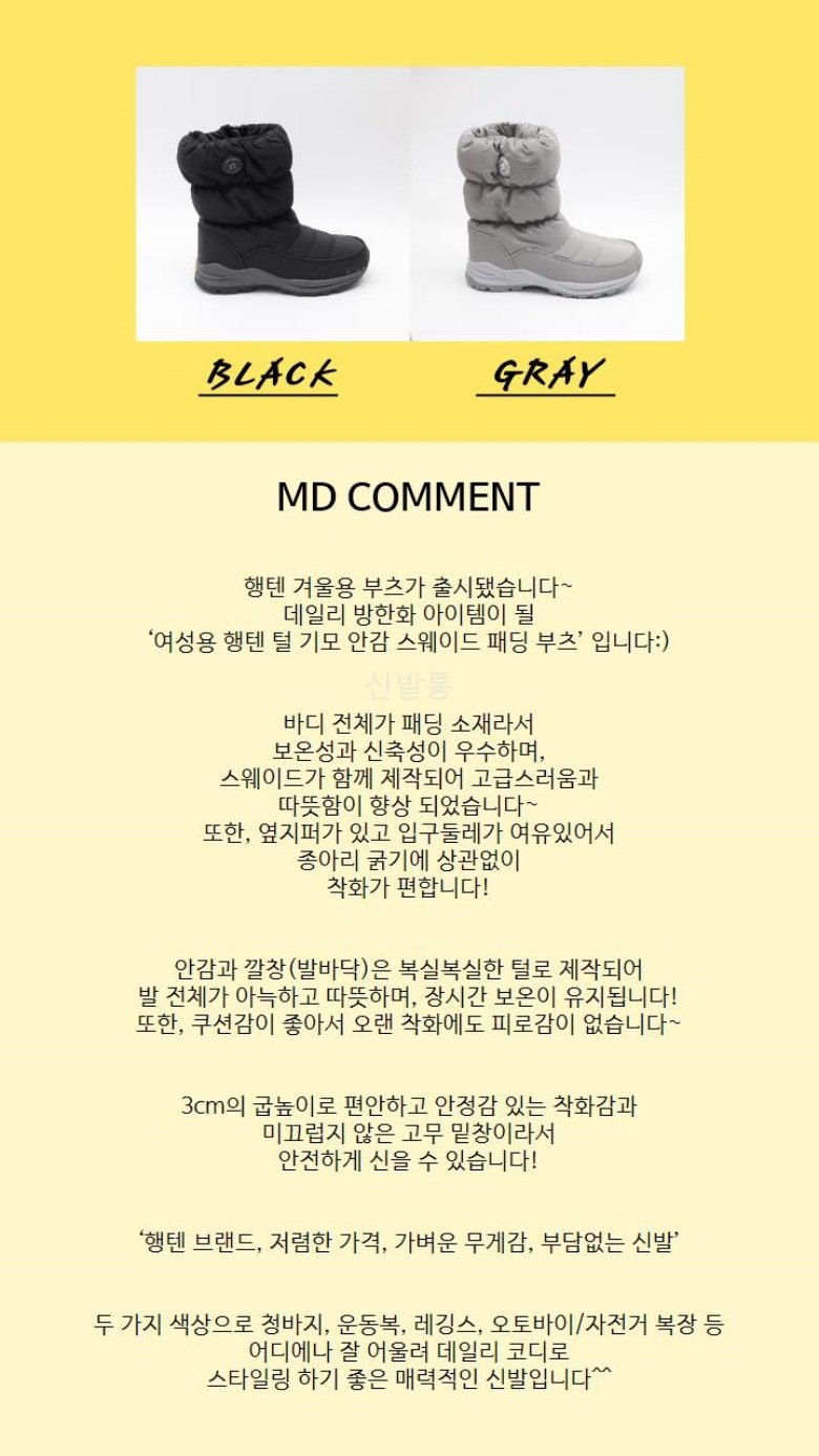 | 제품의 주소재(운동화인 경우에는 겉감,안감을 구분하여 표시) | 패딩(스웨이드)/털 | 색상 | 블랙/그레이 |