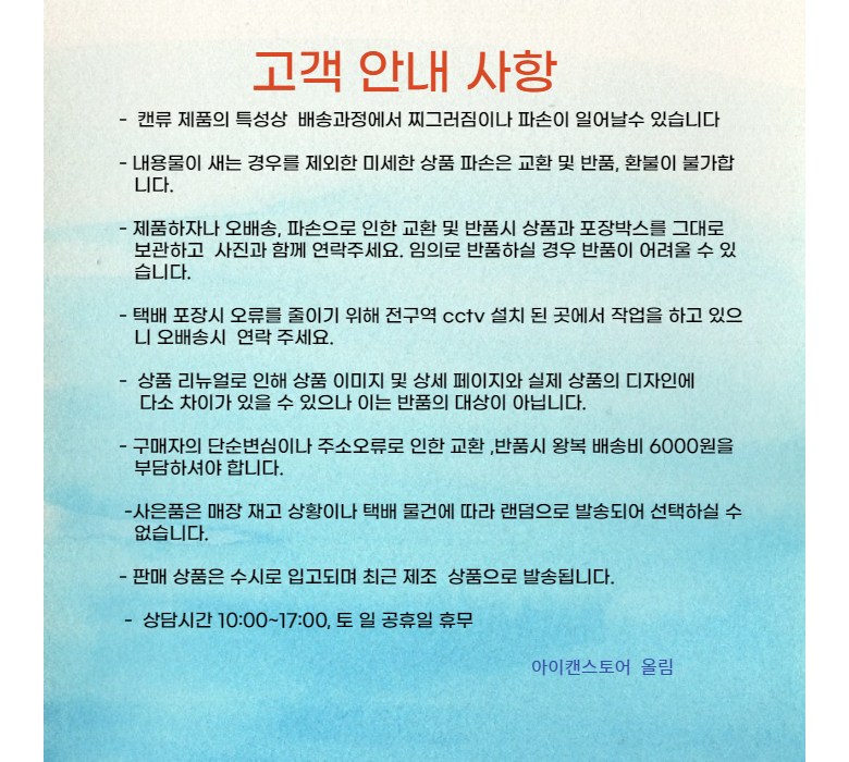 - 상품문의 및 후기게시판을 통해 취소나 환불, 반품 등은 처리되지 않습니다.