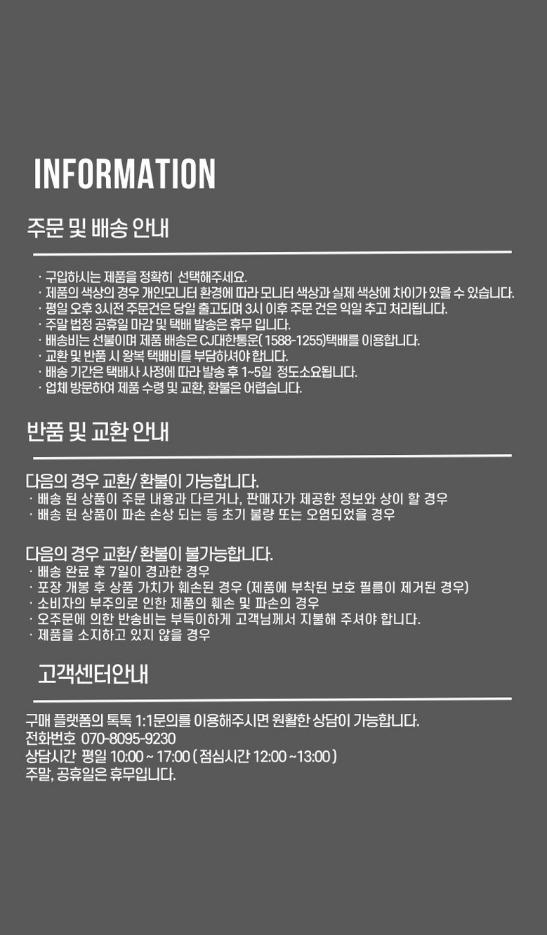 - ㆍ모니터 해상도의 차이로 인해 색상이나 이미지가 실제와 달라, 고객이 단순 변심으로 교환/반품을 무료로 요청하는 경우