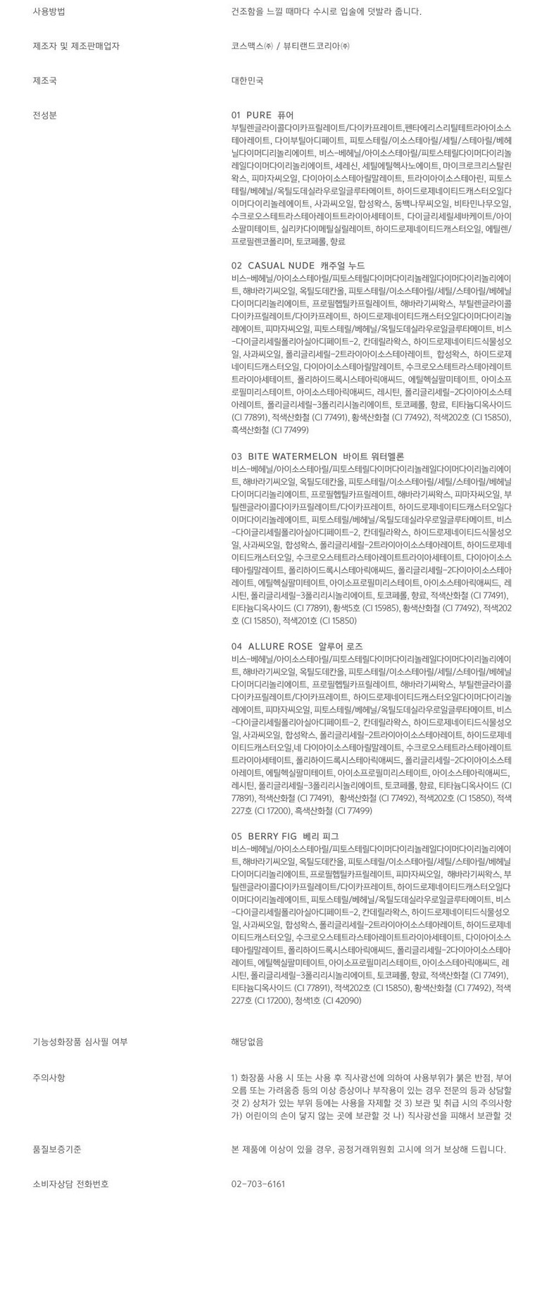 | 화장품제조업자, 화장품책임판매업자 및 맞춤형화장품판매업자 | 상품 상세페이지 참조 | 제조국 | 상품 상세페이지 참조 |