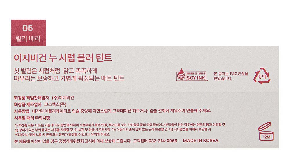 | 화장품제조업자, 화장품책임판매업자 및 맞춤형화장품판매업자 | 코스맥스(주) / (주)이지비건 | 제조국 | 대한민국 |