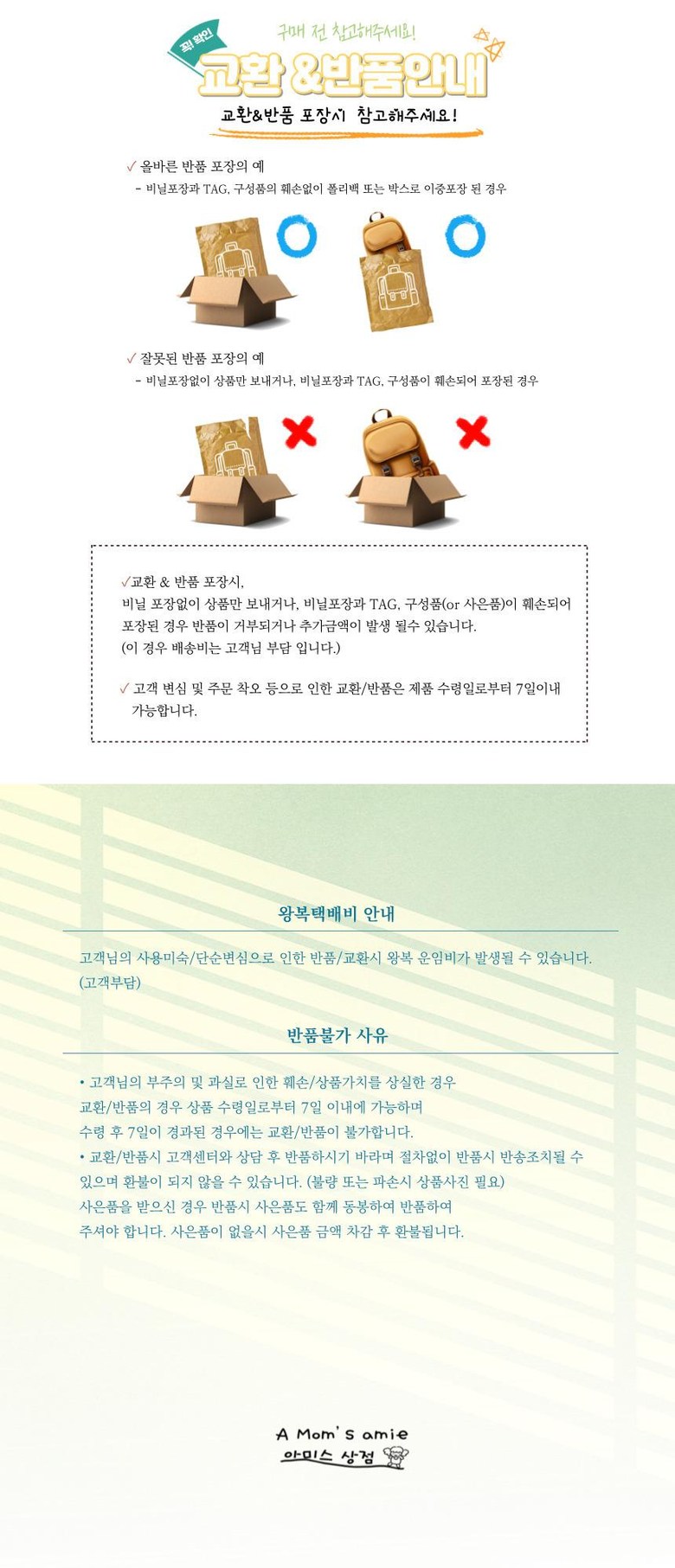 - ㆍ모니터 해상도의 차이로 인해 색상이나 이미지가 실제와 달라, 고객이 단순 변심으로 교환/반품을 무료로 요청하는 경우