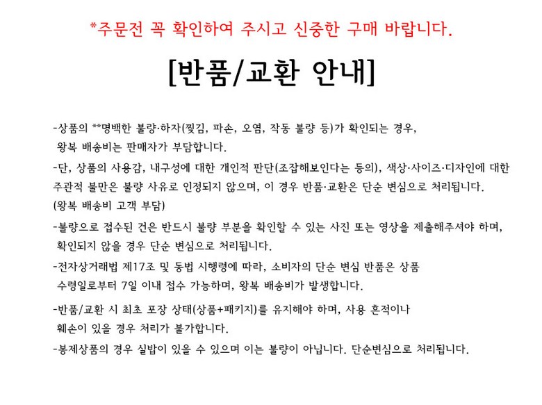 - ㆍ교환/반품에 관한 일반적인 사항은 판매자가 제시사항보다 관계법령이 우선합니다.
