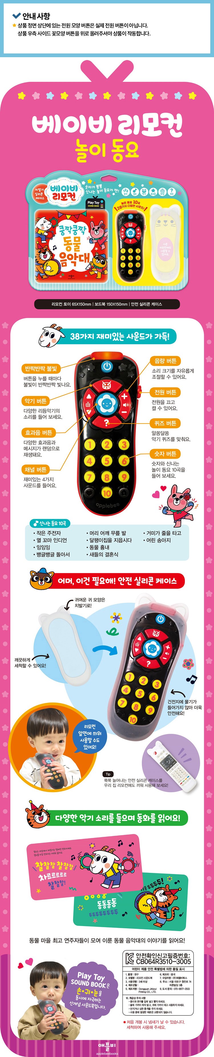 | 품명 및 모델명 | 베이비 리모컨 놀이 동요 : 쿵짝쿵짝 동물 음악대 Play Toy 사운드북 | KC 인증정보 | 본품: 리뉴얼 전- CB064R972-7004 / 리뉴얼 후- CB064R3510-3005, 건전지: B053R5015-17001 |