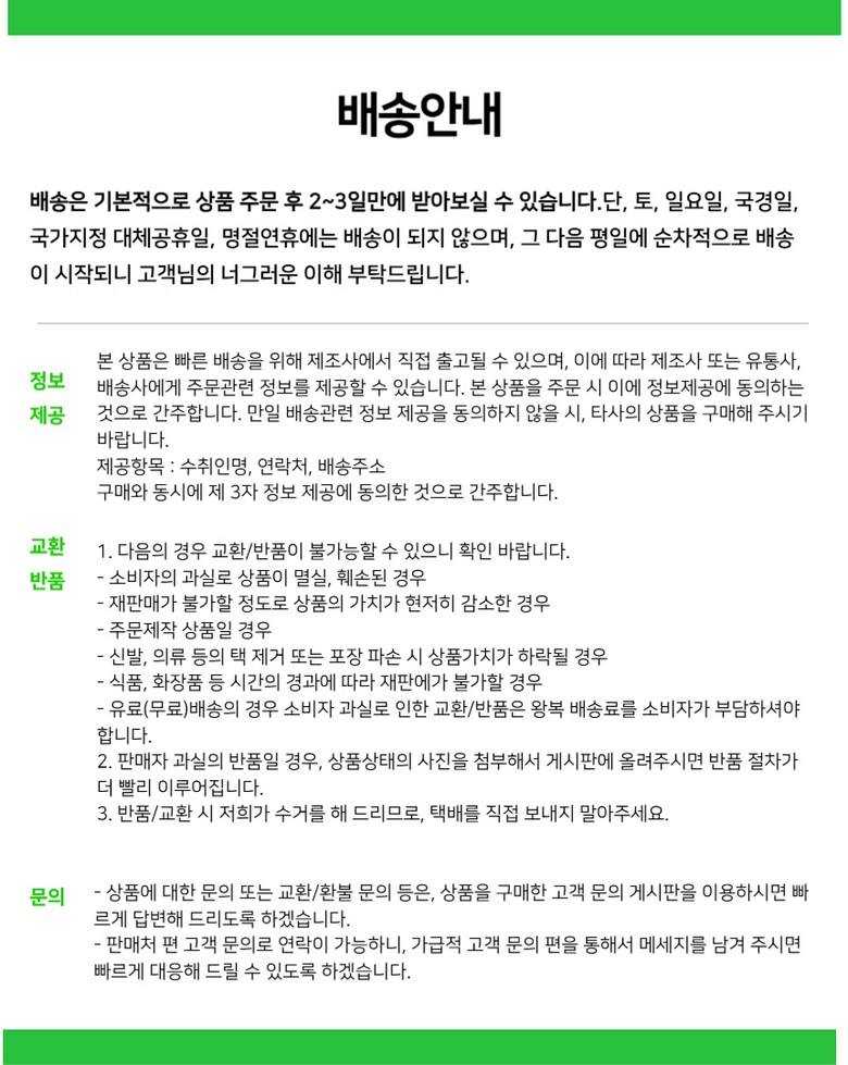 | 배송기간 | ㆍ도서산간 지역 등은 배송에 3-5일이 더 소요될 수 있습니다. - 천재지변, 물량 수급 변동 등 예외적인 사유 발생 시, 다소 지연될 수 있는 점 양해 부탁드립니다. | ||
