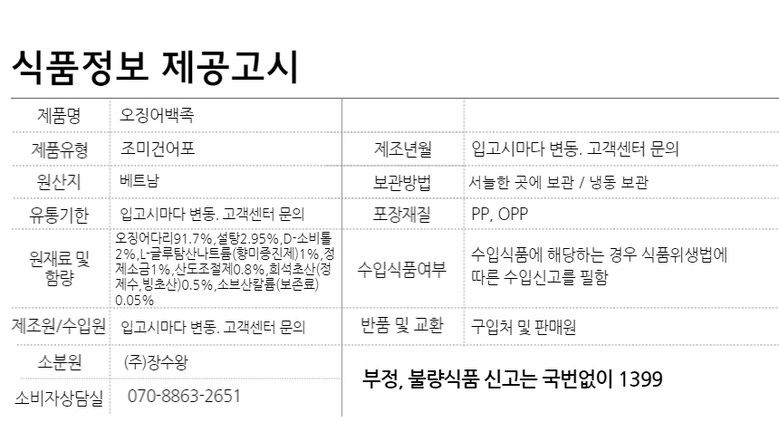 | 제품명 | 상품 상세페이지 참조 | 식품의 유형 | 상품 상세페이지 참조 |