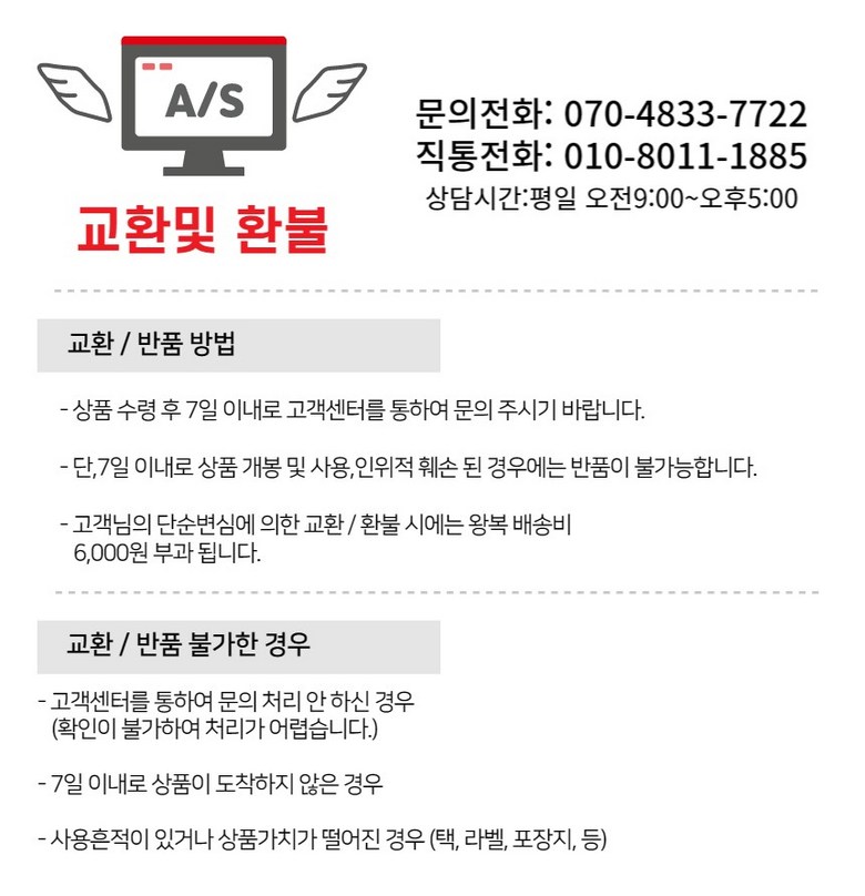 - ㆍ모니터 해상도의 차이로 인해 색상이나 이미지가 실제와 달라, 고객이 단순 변심으로 교환/반품을 무료로 요청하는 경우