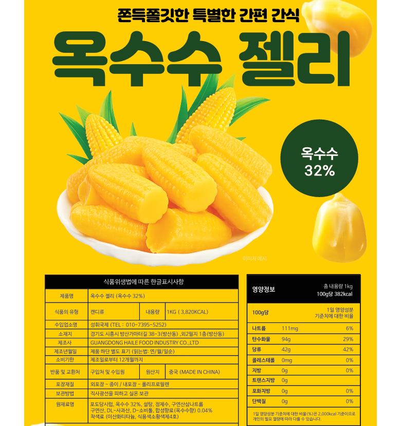 | 품명 및 모델명 | 옥수수젤리 | 인증/허가 사항 | 상품 상세페이지 참조 |