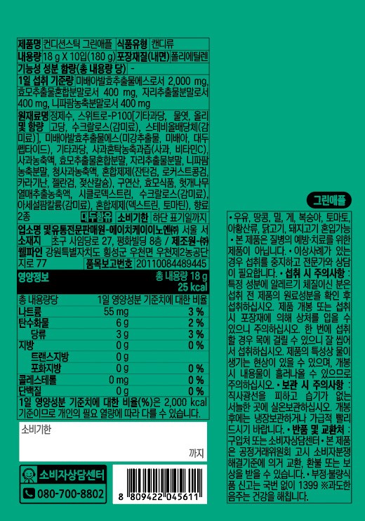 | 포장단위별 내용물의 용량(중량), 수량 | 18g, 20개 | 원재료명 및 함량 | 컨텐츠 참조 |