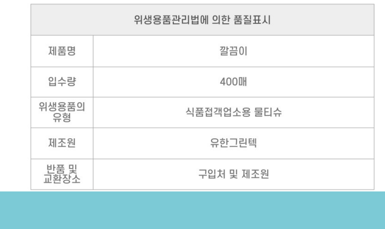 | 품명 및 모델명 | 깔끔이 물티슈 | 인증/허가 사항 | 상품 상세페이지 참조 |