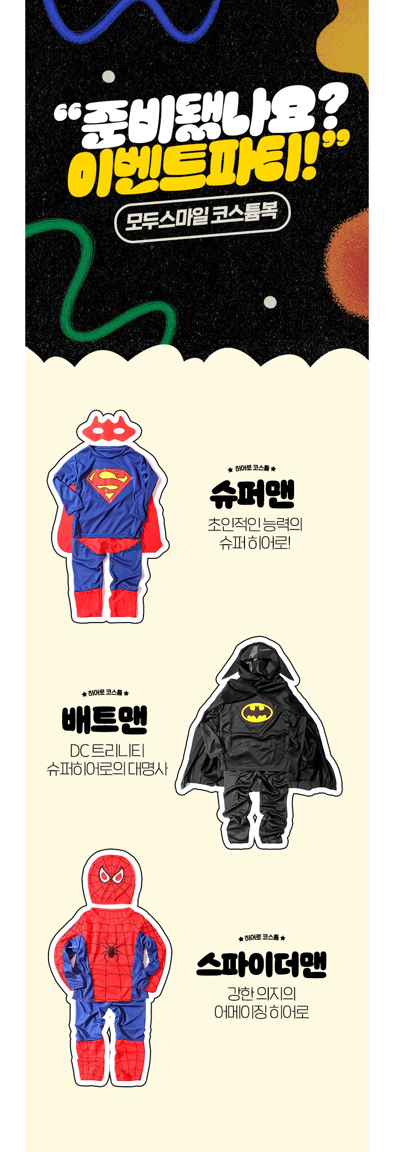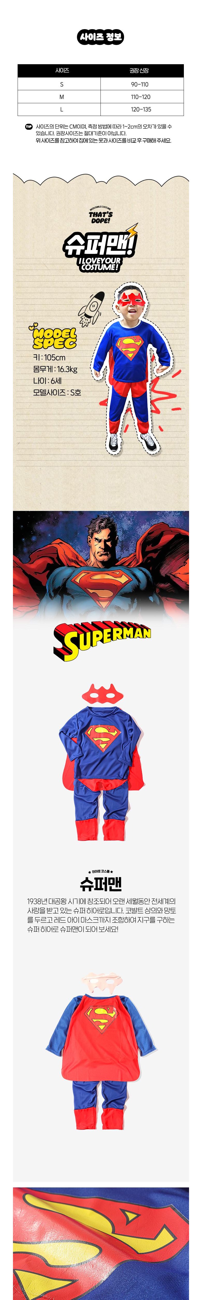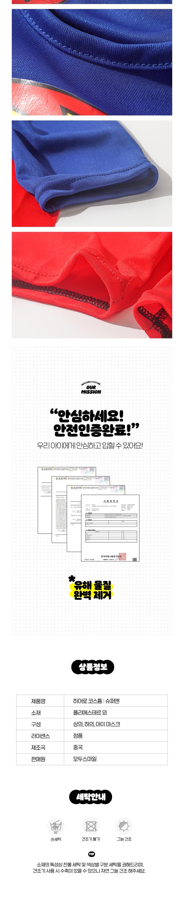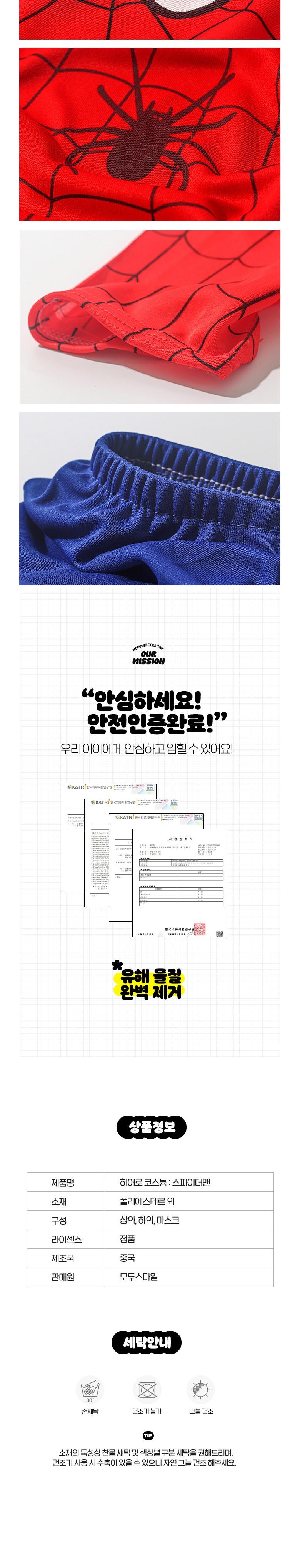 | 품명 및 모델명 | 남아 할로윈 코스튬 마블 슈퍼맨 배트맨 스파이더맨 | 인증/허가 사항 | 한국분석시험연구원 STOB22-00004662 |