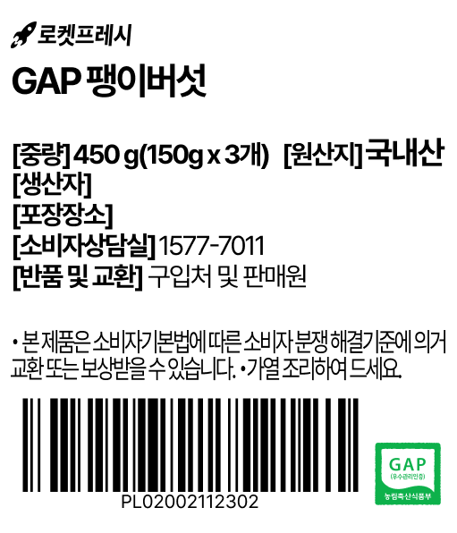 | 품목 또는 명칭 | GAP 팽이버섯 | 포장단위별 내용물의 용량(중량),수량,크기 | 450g(150gx3개입)x6개 |