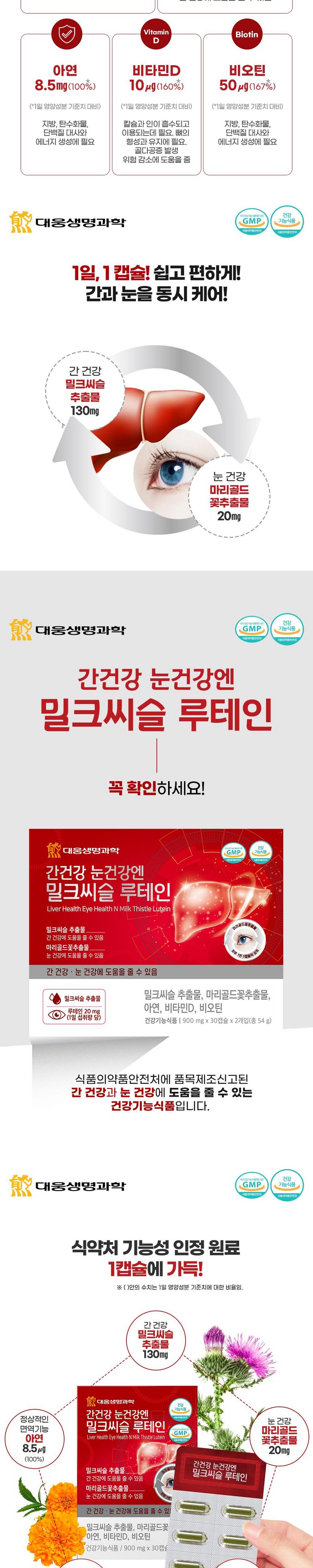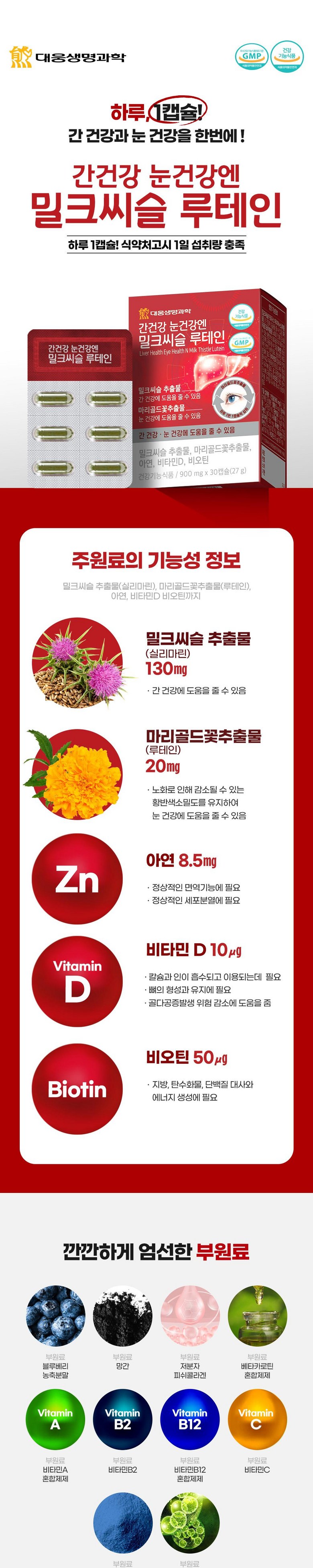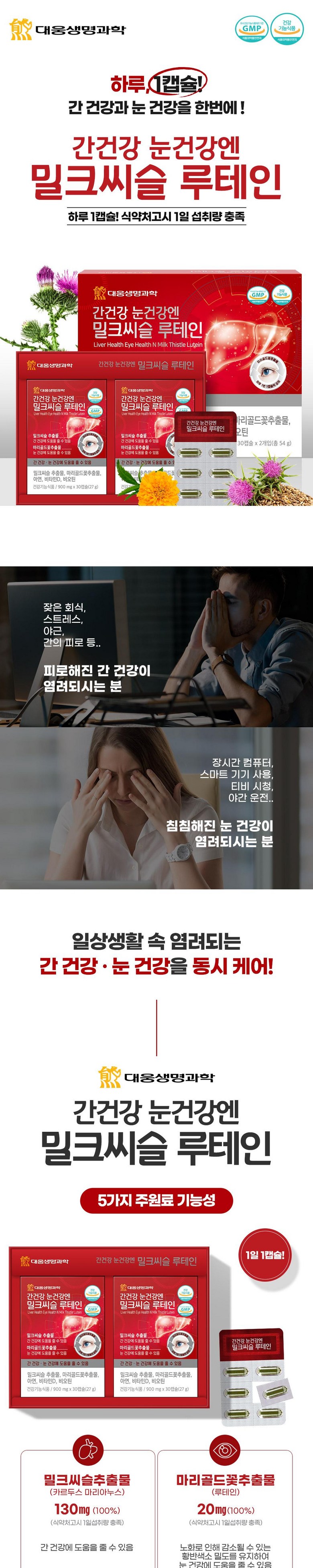 | 제품명 | 대웅생명과학 간건강 눈건강엔 밀크씨슬 루테인 60정 | 제조업소의 명칭과 소재지 | 우리바이오(주)/경기도 안산시 단원구 성곡로 79(성곡동) |