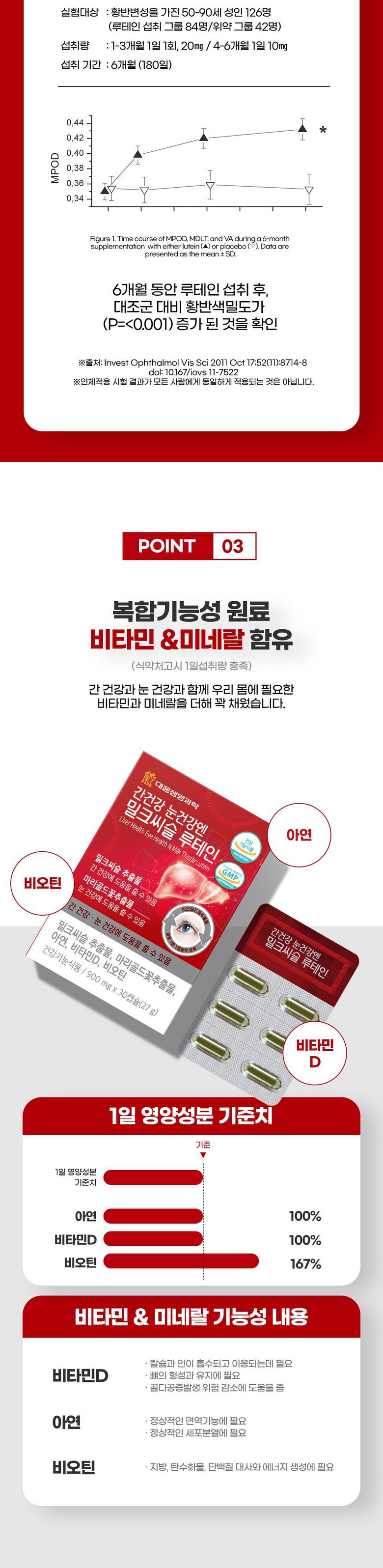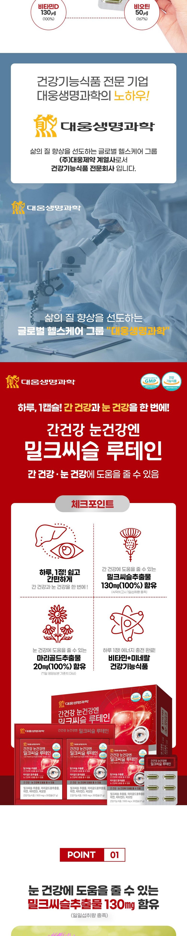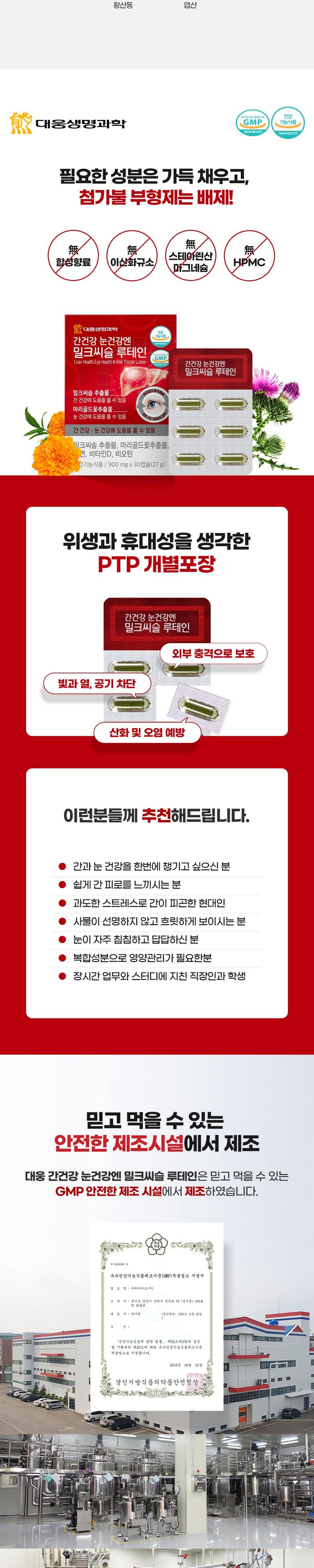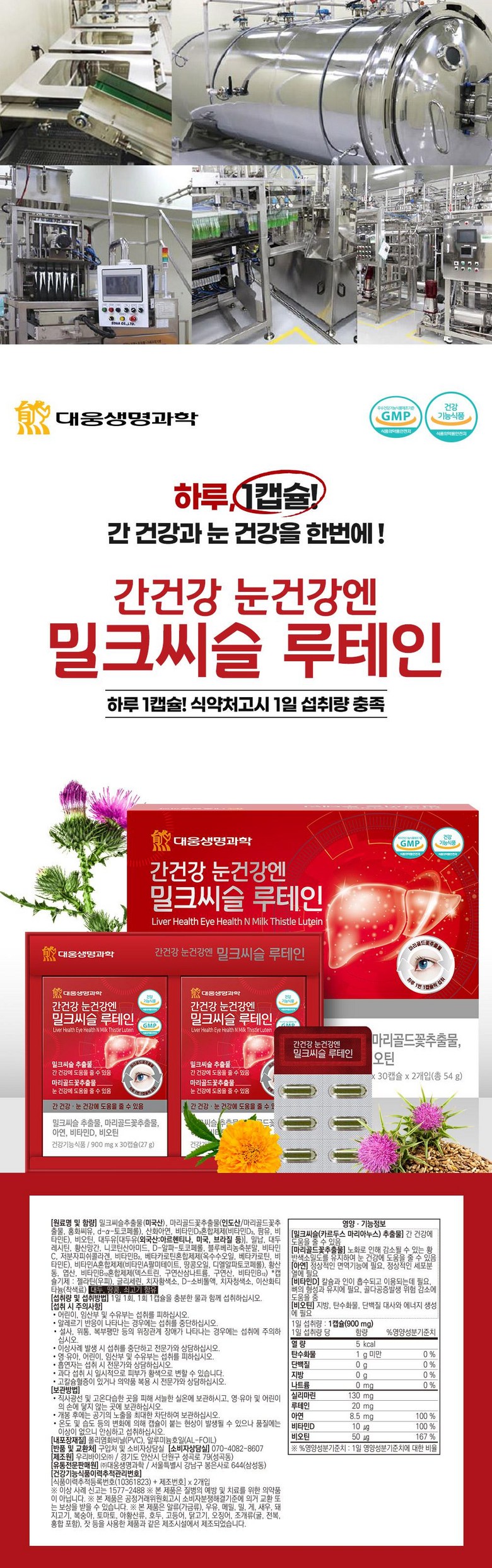 | 제품명 | 대웅생명과학 간건강 눈건강엔 밀크씨슬 루테인 60정 | 제조업소의 명칭과 소재지 | 우리바이오(주)/경기도 안산시 단원구 성곡로 79(성곡동) |